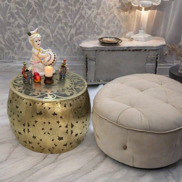 Rajasthani Traditional Nagada (Drum) Table with Embossed Brass Art Embellished. Wooden table with floral brass work on side and edges gives royal touch. Our popular Drum Coffee Table neatly wood finish polish and timeless brass combine to create generous comfort for the living room and beyond.