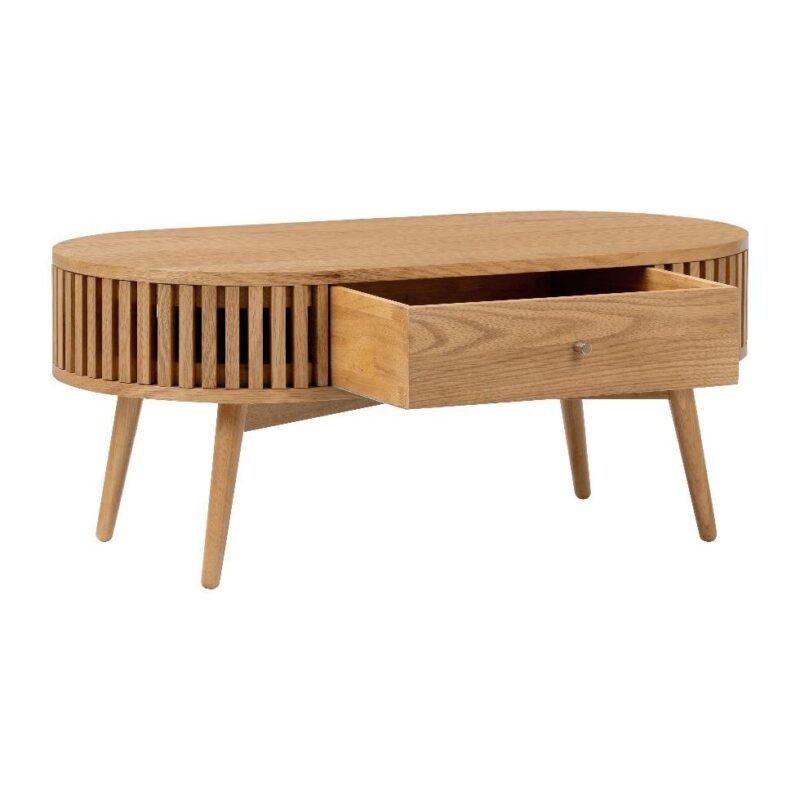 This elegant oval coffee table features a warm natural wood finish with a distinctive slatted apron design. Supported by tapered solid wood legs, it includes a smooth-glide central drawer for convenient storage, blending modern Scandinavian style with everyday functionality—perfect for contemporary living rooms.