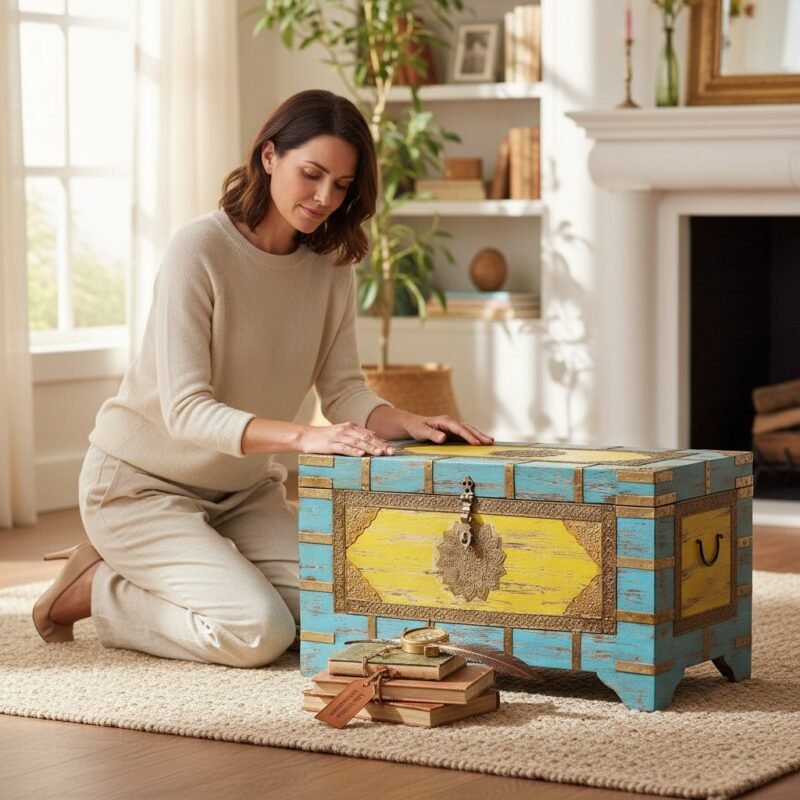 Wooden Brass Storage Trunk Box-Side Coffee Table