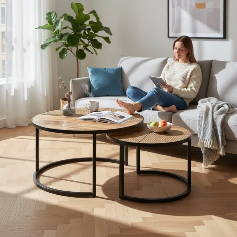 Modern Wood Rattan Coffee Table Setof2