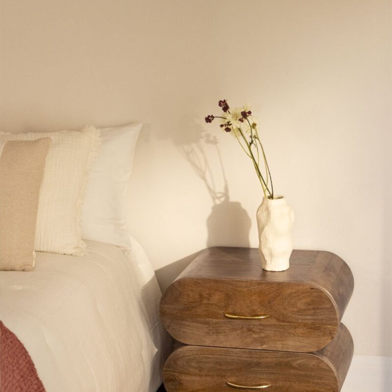 Bring a warm, modern touch to your bedroom with this sculptural solid-wood bedside table. Its soft rounded form and stacked design create a stylish, contemporary statement while offering practical bedside storage. Perfect for keeping nighttime essentials within reach, this piece blends natural beauty with functional elegance for a cozy, well-organized sleeping space.