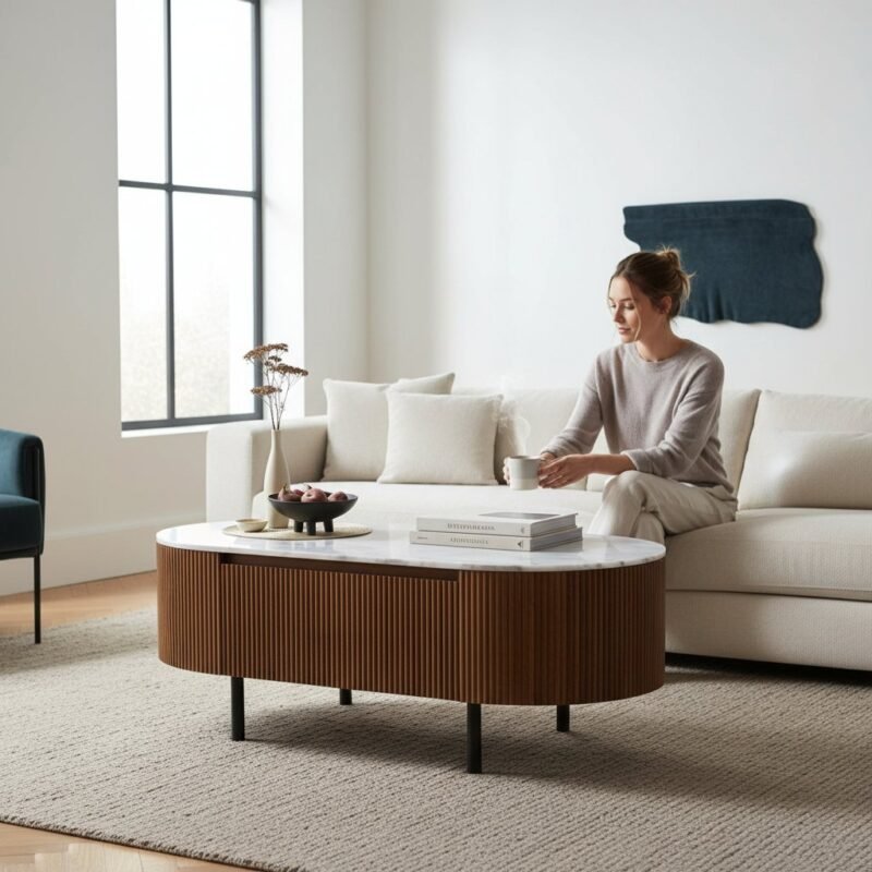 Wooden Oval Coffee Table Marble Top