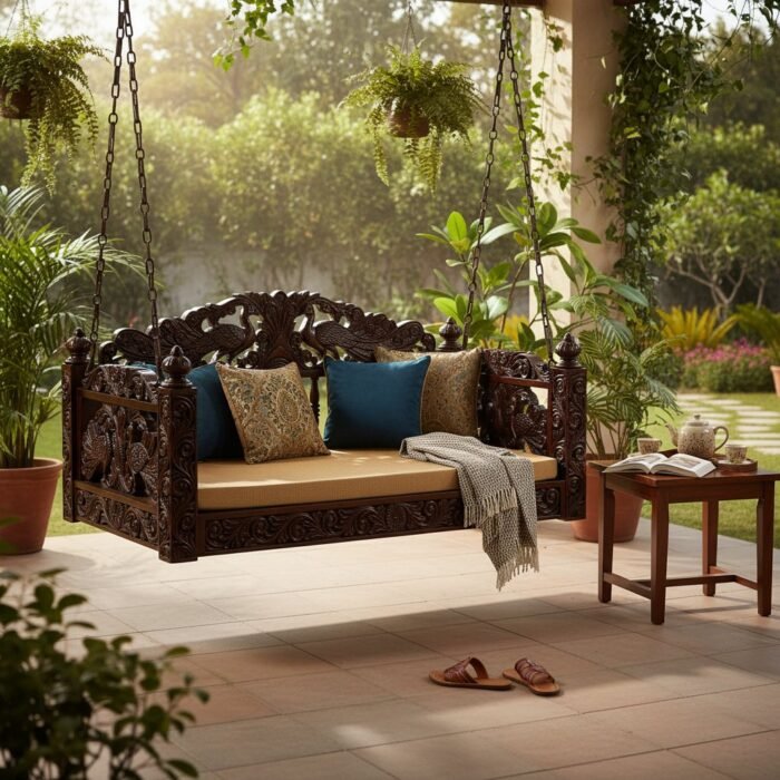 Handcarved Wooden Peacock Design Swing Jhula With Cushion