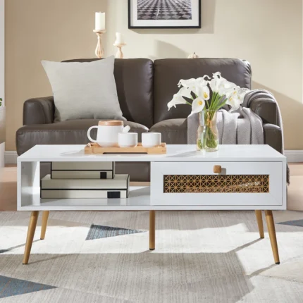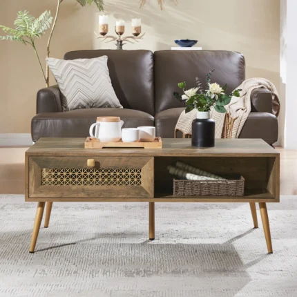 Upgrade your living room with this stylish wooden coffee table with sliding door storage, crafted in a natural wood finish with golden legs. Featuring open shelves and a sliding rattan-style door, it provides ample space for keeping books, magazines, baskets, and daily essentials organized. The sleek mid-century modern design with angled legs makes it a perfect center table for contemporary homes.