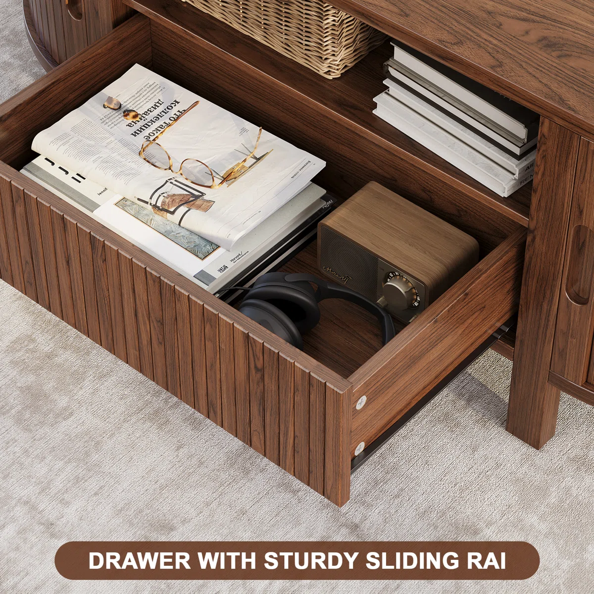 Wooden Coffee Table with Sliding Doors & Open Shelf