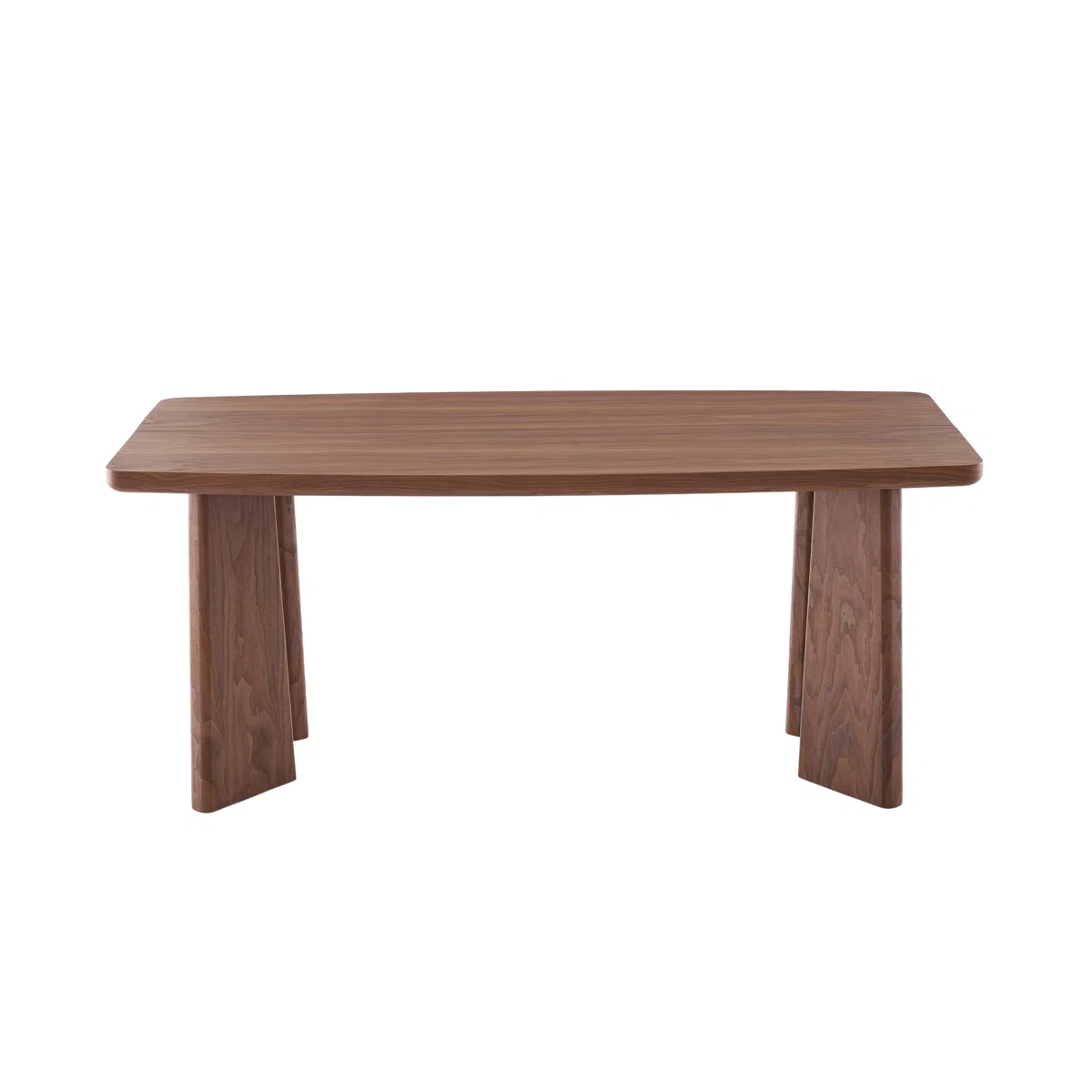 This elegant dining table is designed not only for intimate family dinners and gatherings with friends and is suitable for a dining room or open kitchen. Its unique design also makes it ideal for placement in high-class banquets and restaurants, adding a dazzling shine to your party. The Tabletop is crafted from MDF and Walnut Veneer with a classic vintage tone that perfectly reflects the natural wood grain changes, adding a touch of warmth and personality to your space. The curved double-pedestal table legs are made of solid wood, providing stable support and durability. With a length of 71 inches, this rectangular dining table can accommodate up to six people, bringing modern and sleek style to your home and offering ultimate enjoyment.