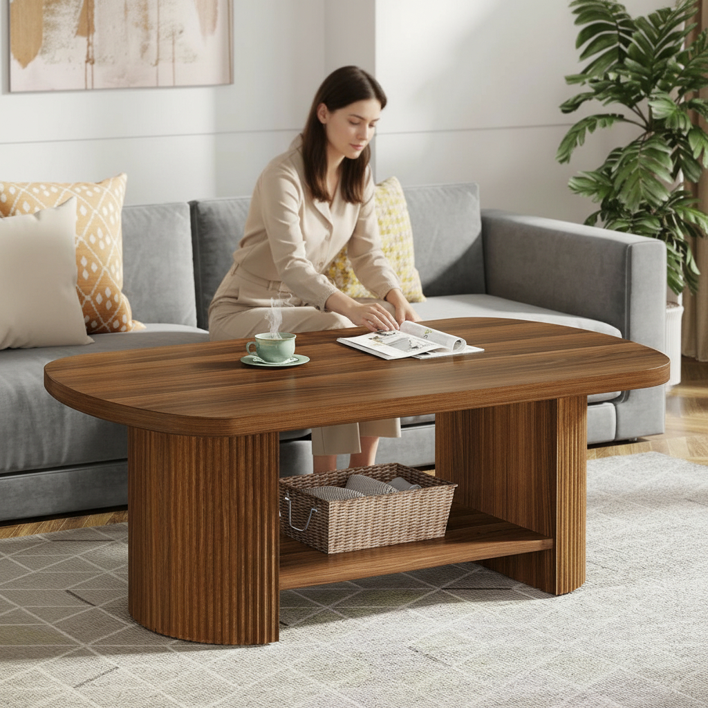 Modern Oval Wooden Coffee Table with Sliding Doors & Storage