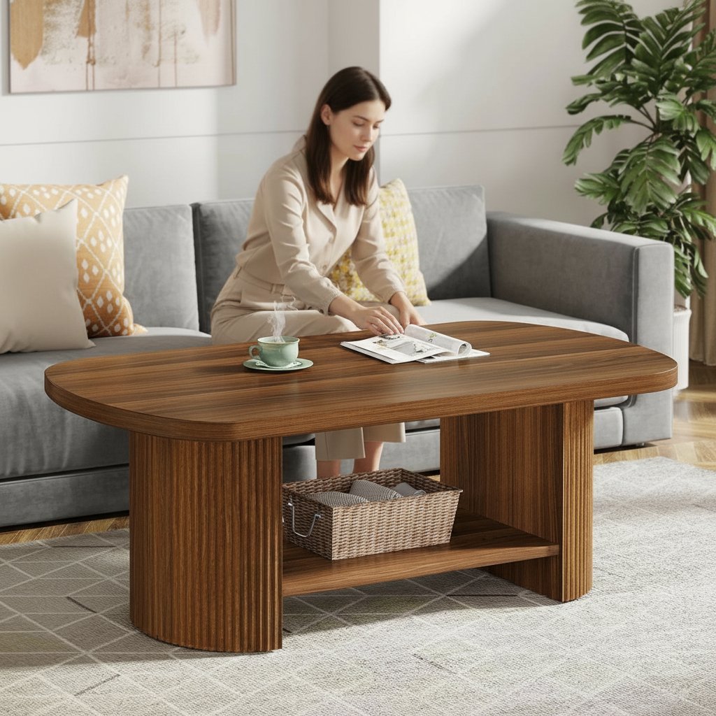 Wooden Coffee Table with Sliding Doors & Open Shelf