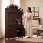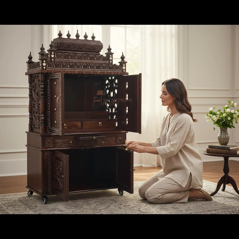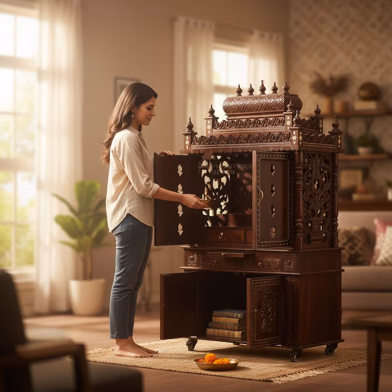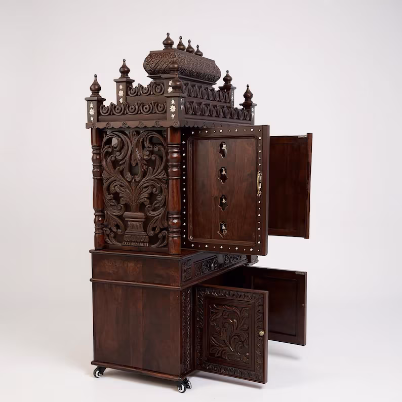 Enhance your home with this handcrafted wooden temple, offering a grand and sacred space for your daily prayers and spiritual rituals. Its unique design and functional utility make it a delightful addition to any home decor, reflecting the rich cultural heritage and skilled craftsmanship of Indian artisans.
