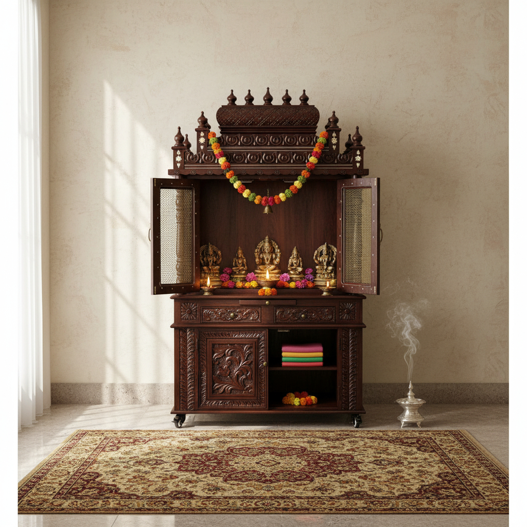 Elevate the spiritual ambiance of your home with this magnificent handcrafted wooden temple. Featuring intricate carvings, brass inlays, and a grand design, this temple is an embodiment of traditional craftsmanship and elegance.
