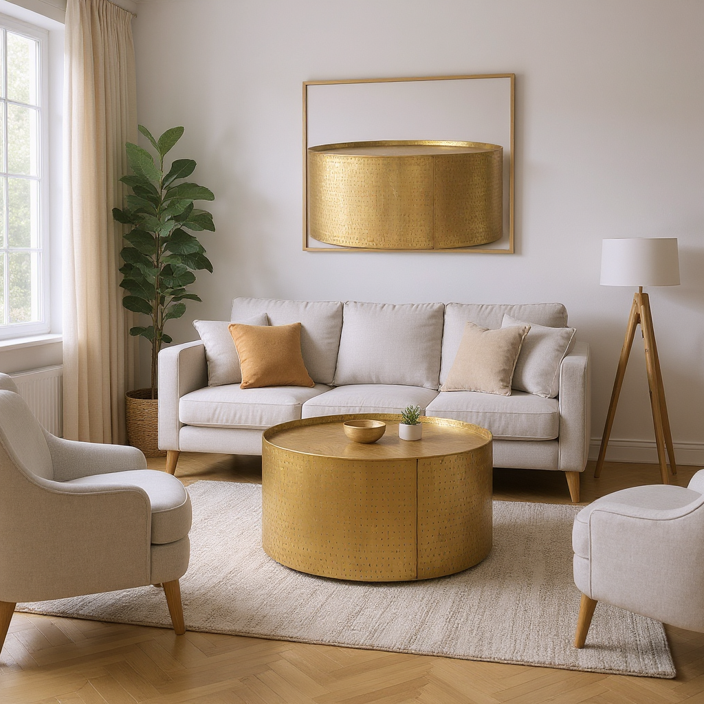Category: Coffee Table Tags: Brass Coffee table, coffee table, Drum Coffee Table, Wooden Drum Table