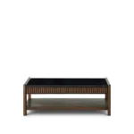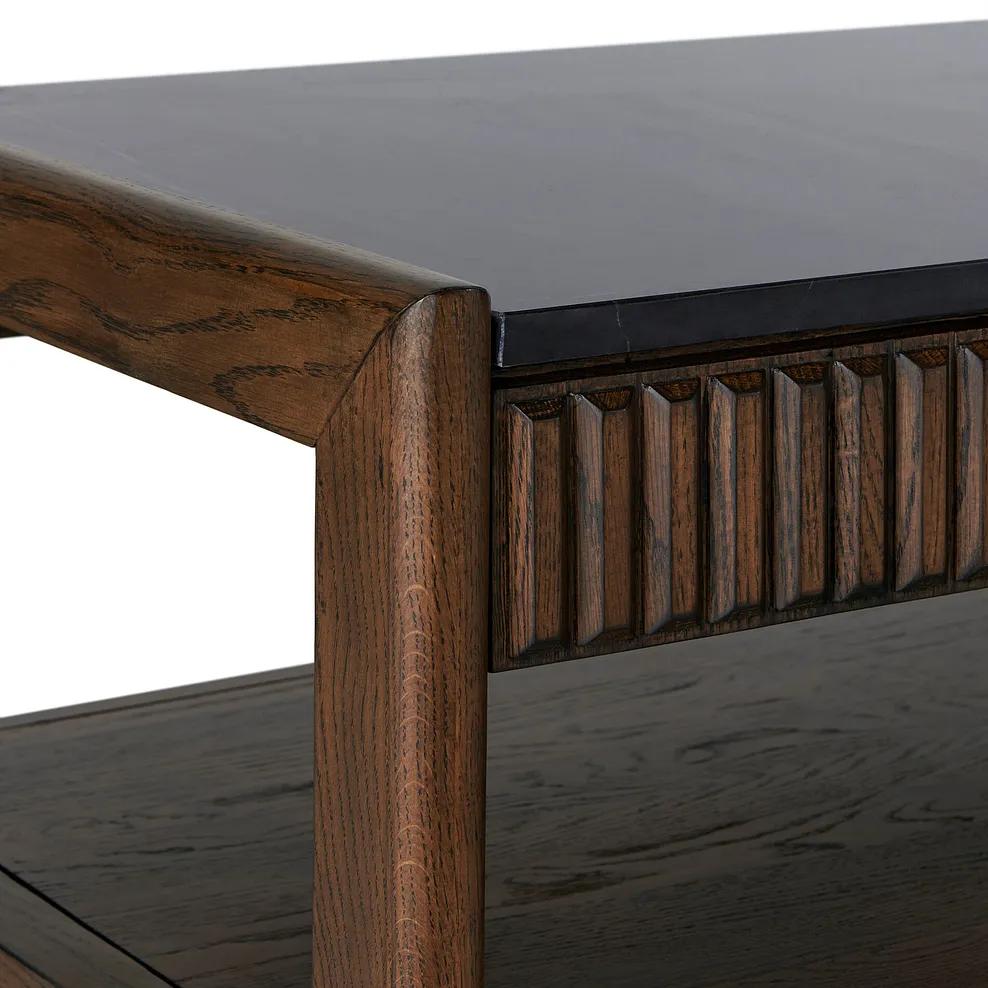 This modern wooden coffee table combines timeless elegance with practical design. Featuring a sleek black marble top and ribbed detailing, it adds a touch of luxury to any living space. The sturdy wooden frame includes an open lower shelf, perfect for storing books, magazines, or decorative accents. Stylish yet functional, this coffee table is an ideal centerpiece for contemporary interiors.