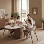 This contemporary dining set is designed to bring elegance and comfort to your home. The rectangular wooden dining table features a ribbed panel base and a smooth finish, combining durability with modern style. Accompanied by six upholstered chairs with curved backs and cushioned seats, the set provides both support and sophistication, making it perfect for everyday meals or special gatherings.