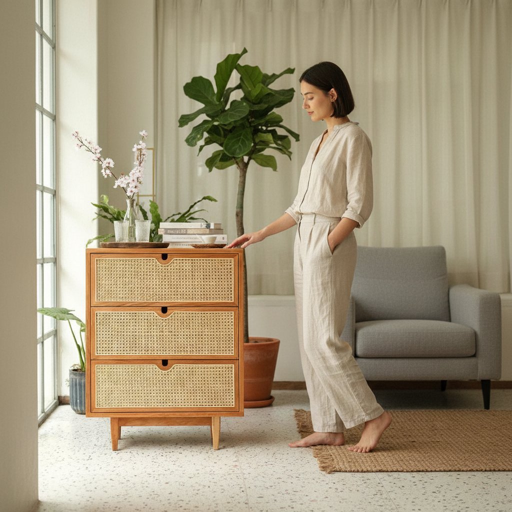 Solstice Cane Chest Of Drawers ₹45,999 Original price was: ₹45,999.₹39,999Current price is: ₹39,999.
