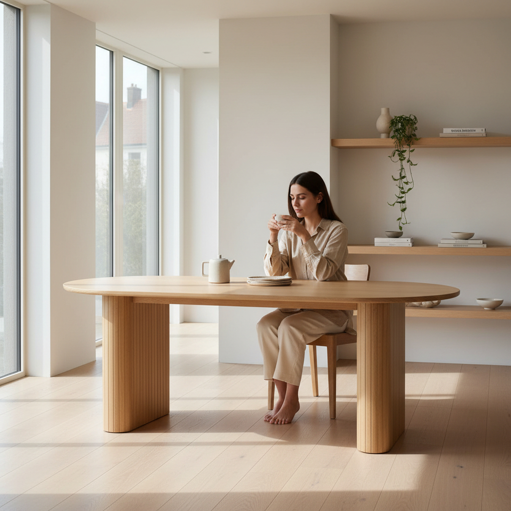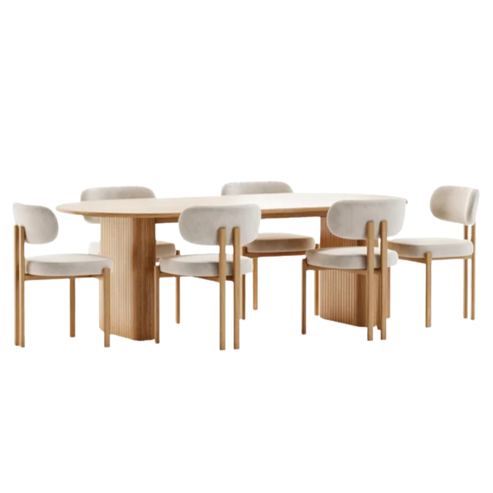 This contemporary dining set is designed to bring elegance and comfort to your home. The rectangular wooden dining table features a ribbed panel base and a smooth finish, combining durability with modern style. Accompanied by six upholstered chairs with curved backs and cushioned seats, the set provides both support and sophistication, making it perfect for everyday meals or special gatherings.