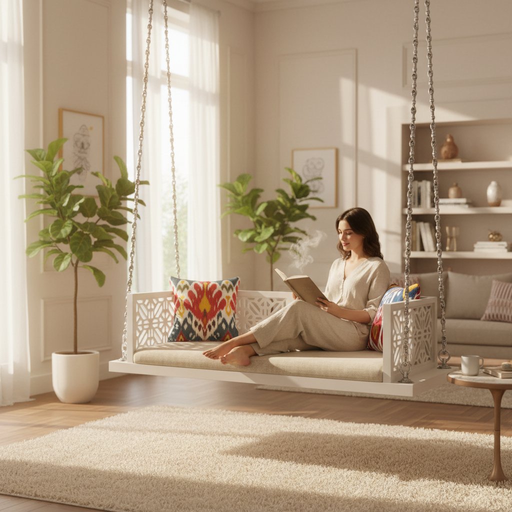 andcrafted Wooden White Lattice Swing Jhula With Silver Chains