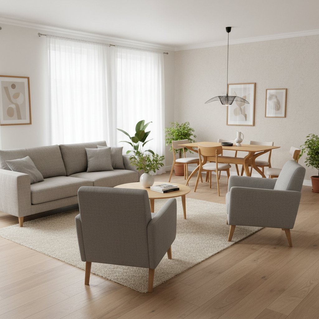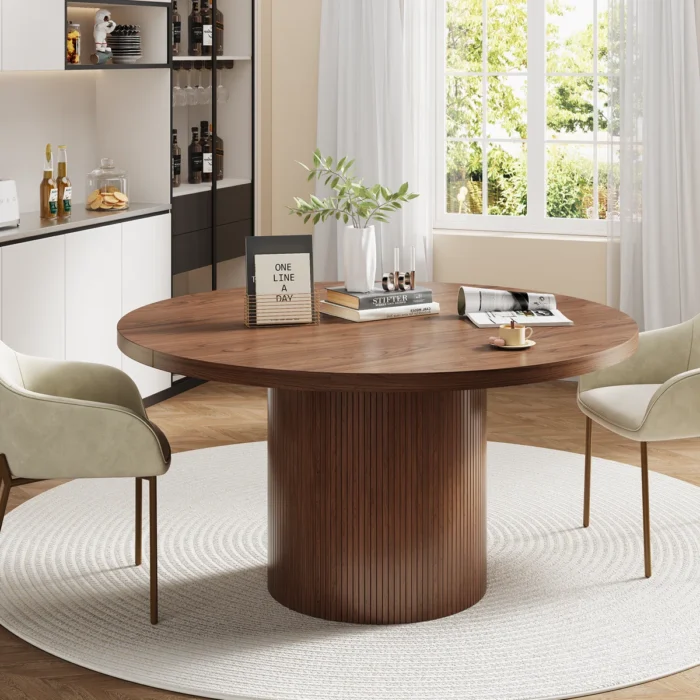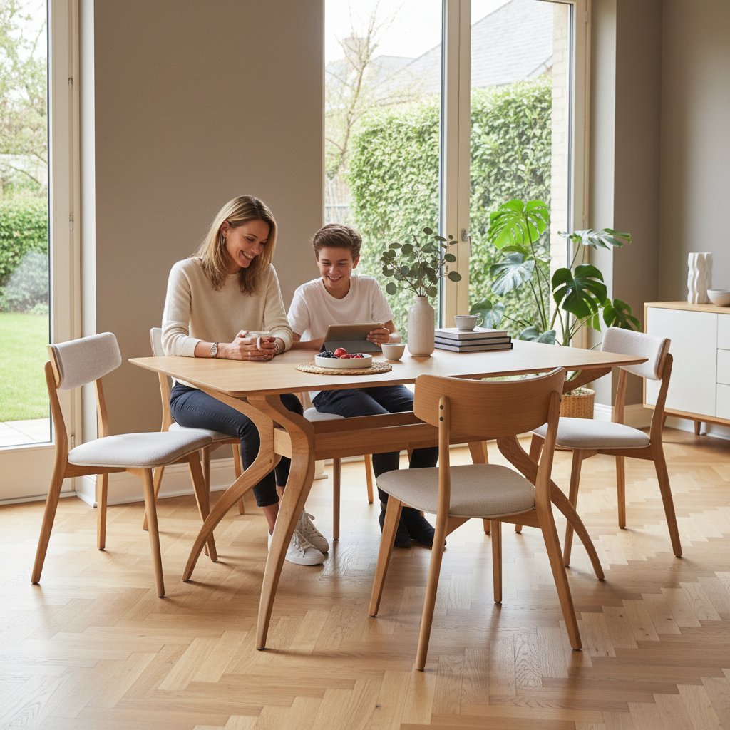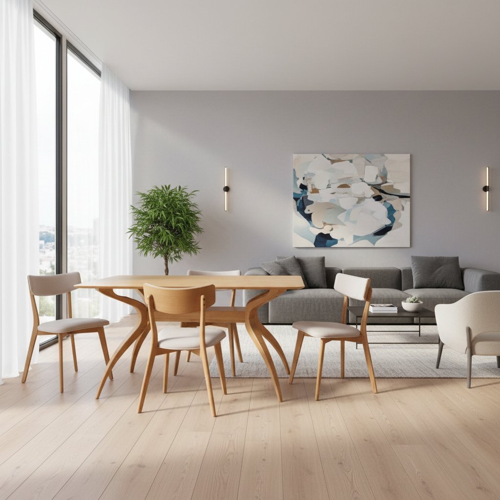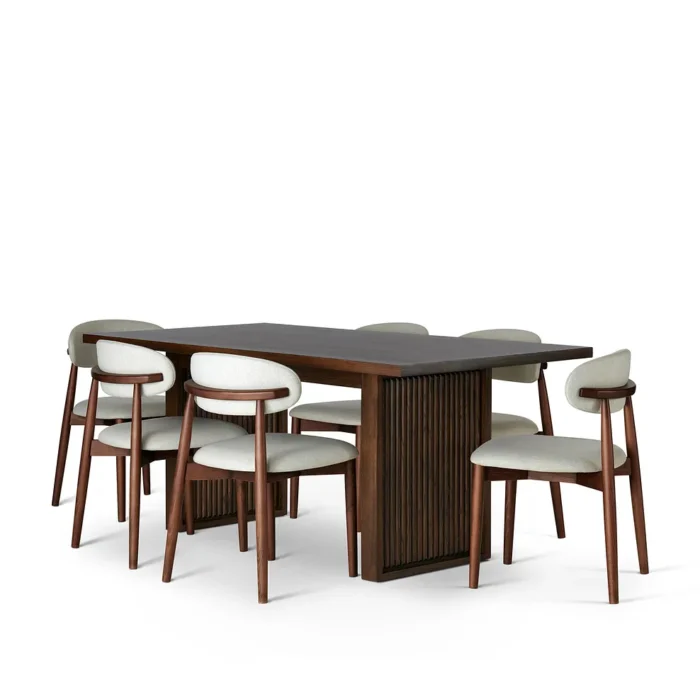 This contemporary dining set is designed to bring elegance and comfort to your home. The rectangular wooden dining table features a ribbed panel base and a smooth finish, combining durability with modern style. Accompanied by six upholstered chairs with curved backs and cushioned seats, the set provides both support and sophistication, making it perfect for everyday meals or special gatherings.
