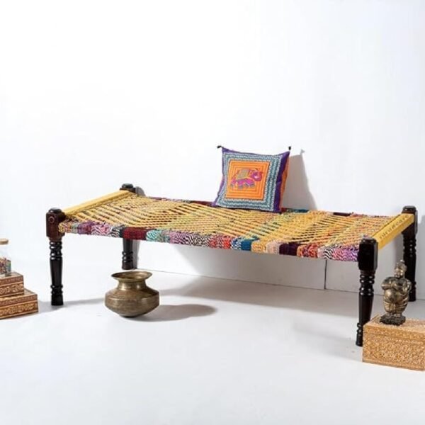 Brand : Vm Antique Decor Material : Wood Frame And Jute Rope Dimension :- Small Size-L 153 X W 64 X H 38 (cm) Large Size-L 181 X W 76 X H 46 (cm) Finish : Natural Wood Finish Colour : Beige Base With Multicolor Weave Assembly : Assembly Required Country of Origin : India Care : Clean Surfaces With a Dry Cloth.