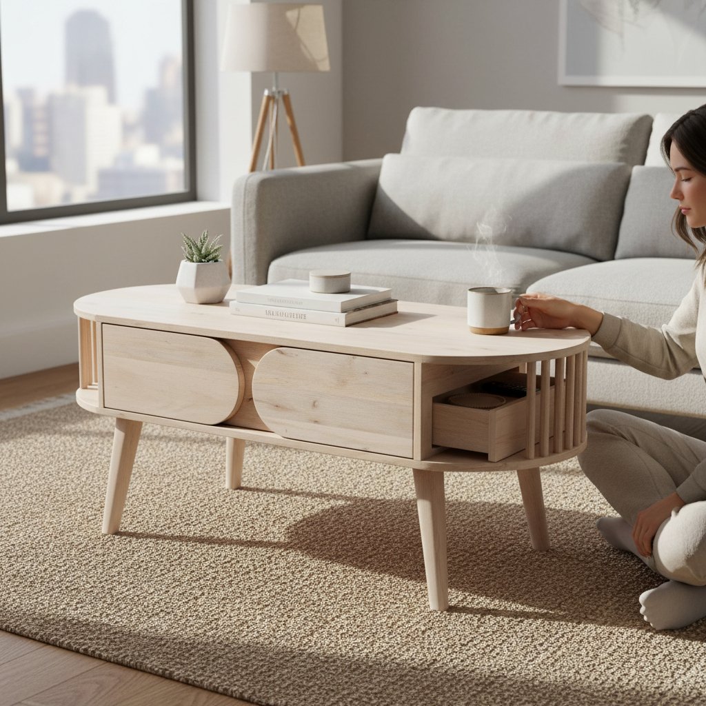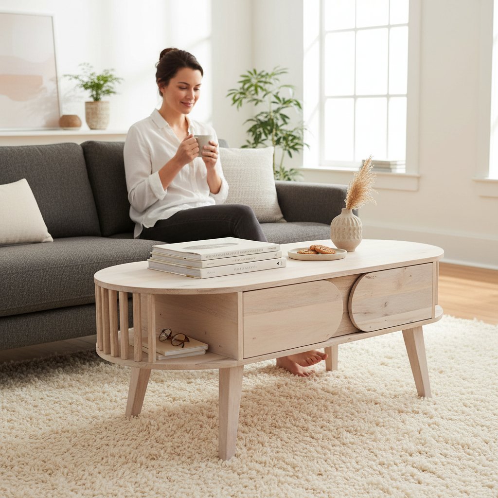 Modern Oval Wooden Coffee Table with Sliding Doors & Storage