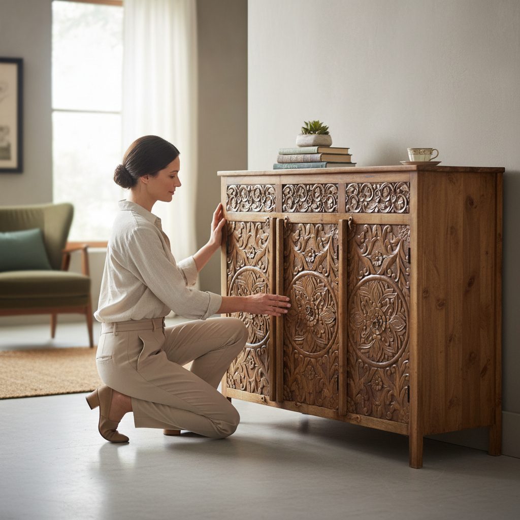 Brand : Vm Antique Decor Material : Solid Wood Colour-Natural Dimensions:- H 38 x W 119 x D 61 Wipe clean with soft cloth. Avoid chemical cleaners Assembly required Made in India