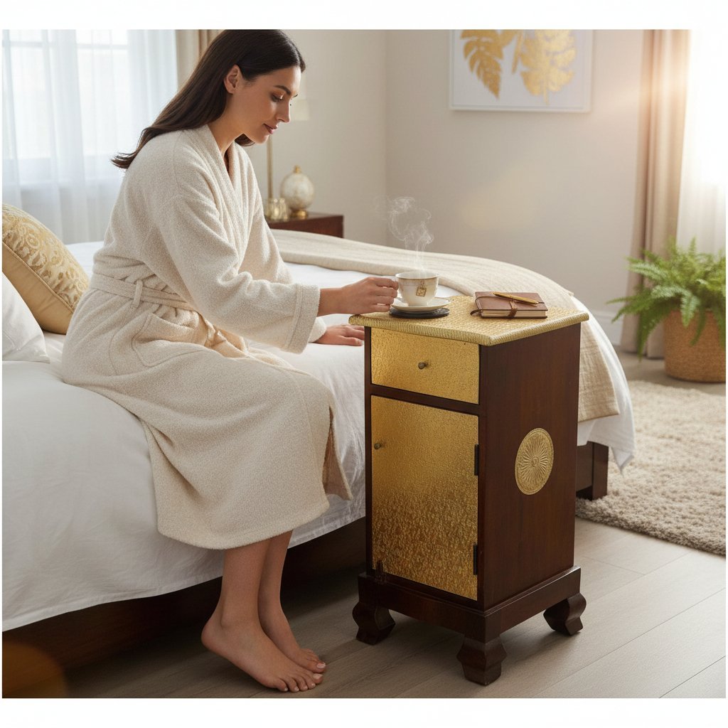 Brand : Vm Antique Decor Material : Solid Wood And Brass Inlay Dimension :  L27 x W14 x H27  (inch) Finish : Handcrafted Polished Colour : Dark Brown And Antique Gold Assembly : No Assembly Required Country of Origin : India Care : Clean Surfaces With a Dry Cloth.