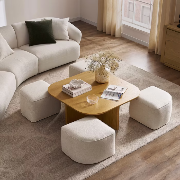 Brand : Vm Antique Decor Material : Solid Wood & Fabric Upholstery Dimension :- Table L 110 cm × W 110 cm × H 43 cm Ottoman L 54 cm × W 54 cm × H 39 cm Finish : Natural Wood Finish Colour : Light Oak & Beige Assembly : Assembly Required Country of Origin : India Care : Clean Surfaces With a Dry Cloth.