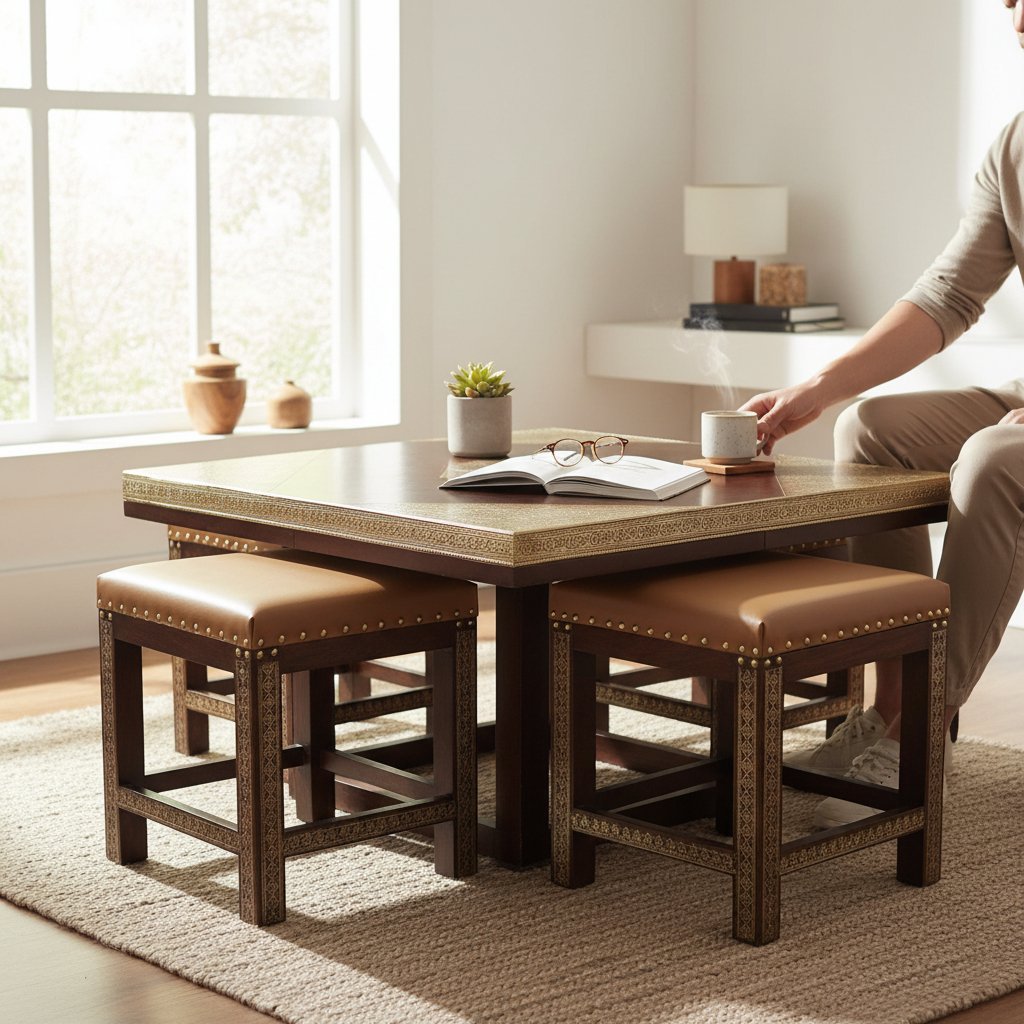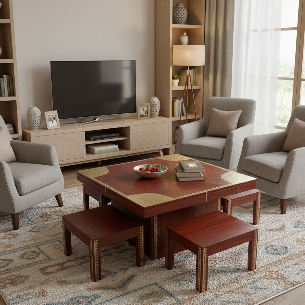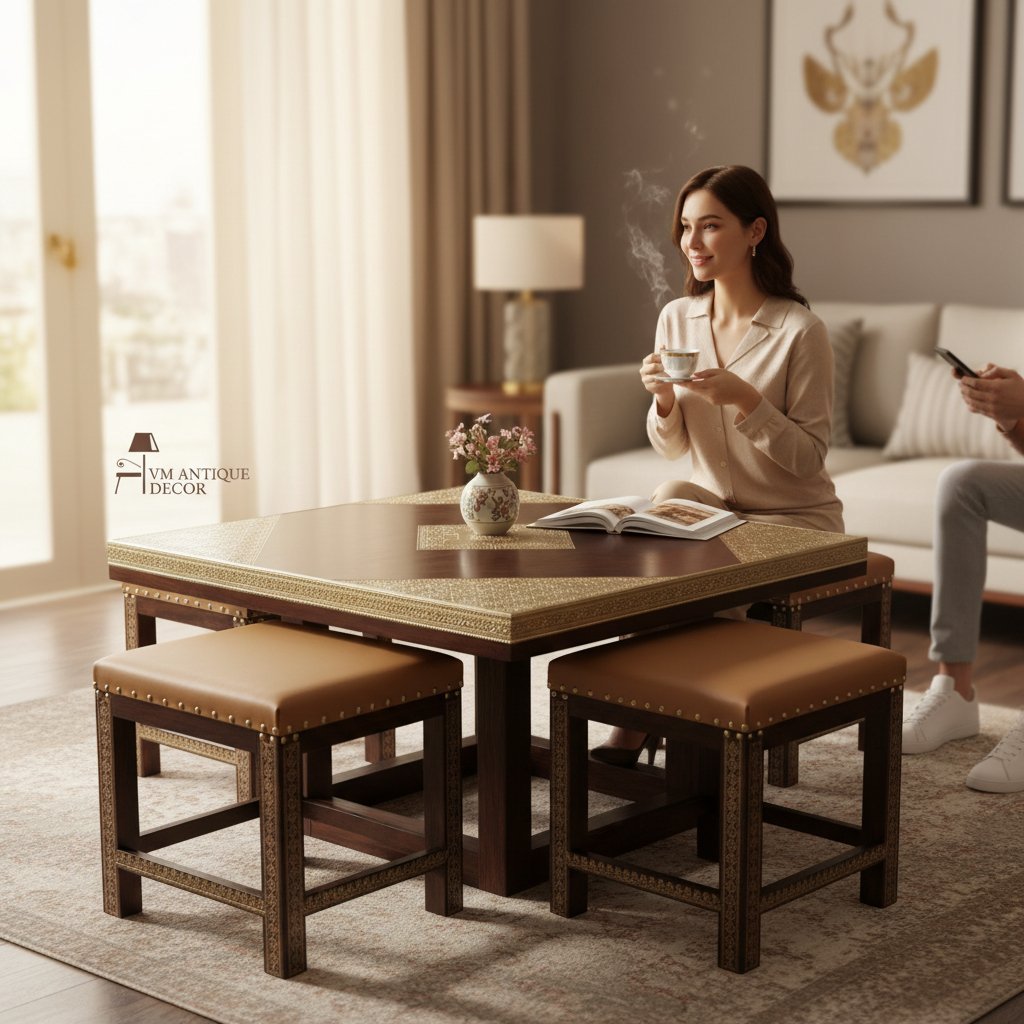 Home Coffee Table Wooden Brass Coffee Table With 4 Chair