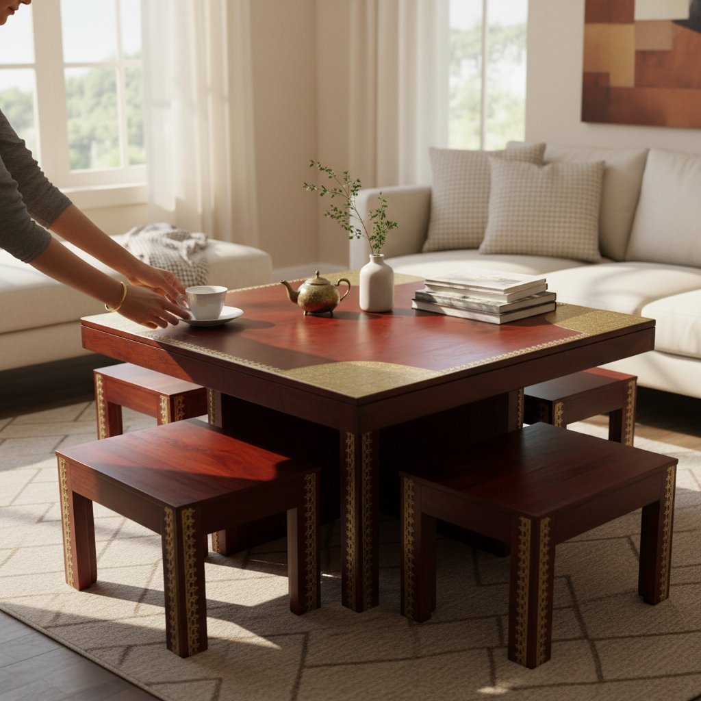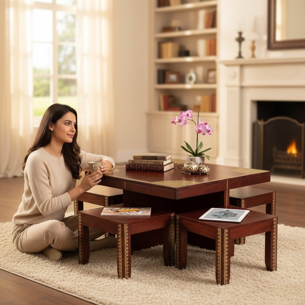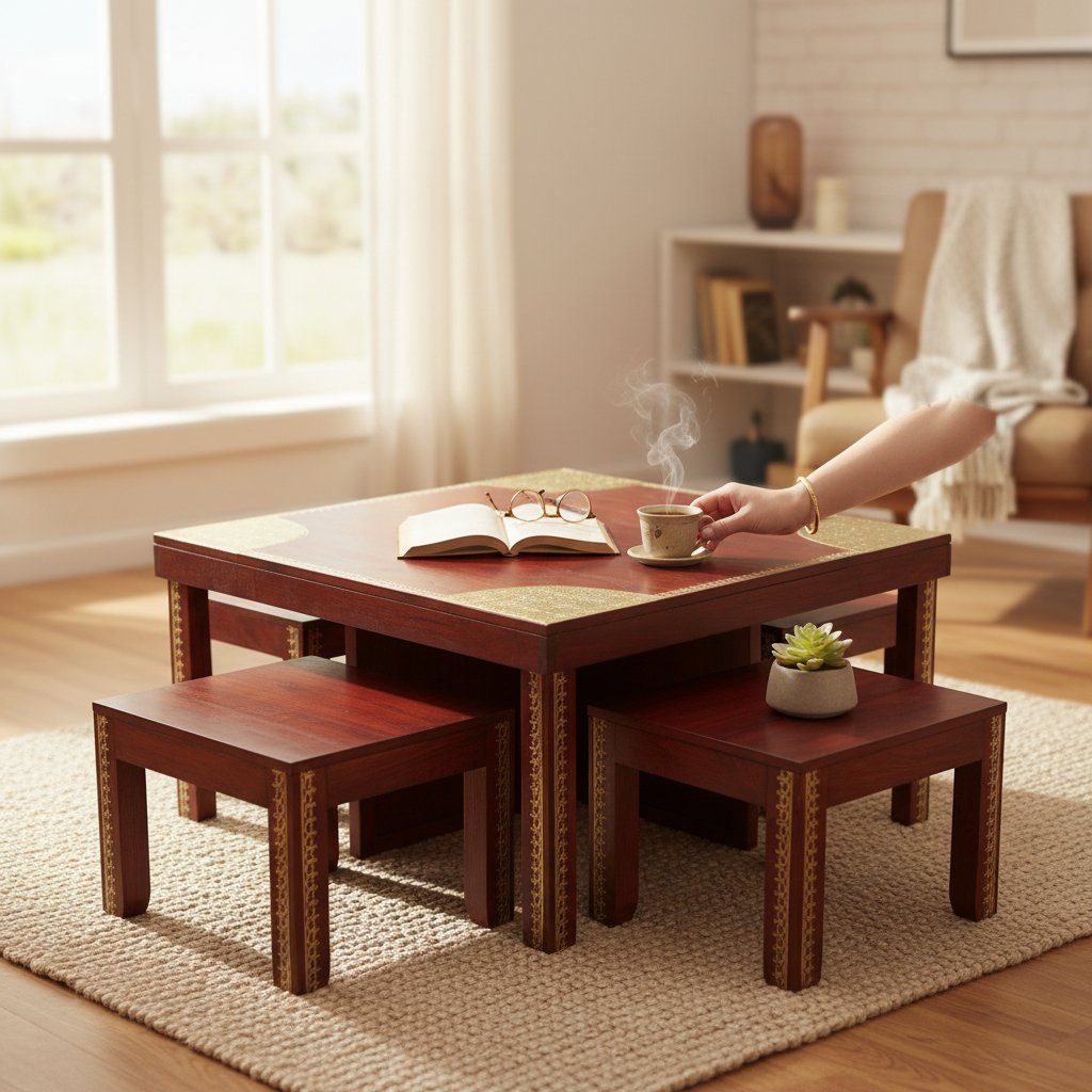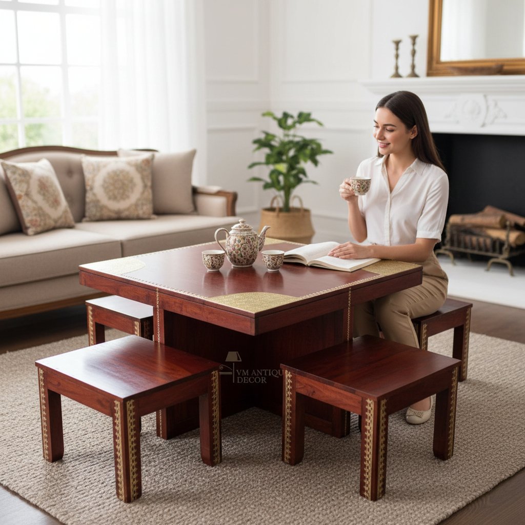 Home Coffee Table Wooden Brass Coffee Table With 4 Chair