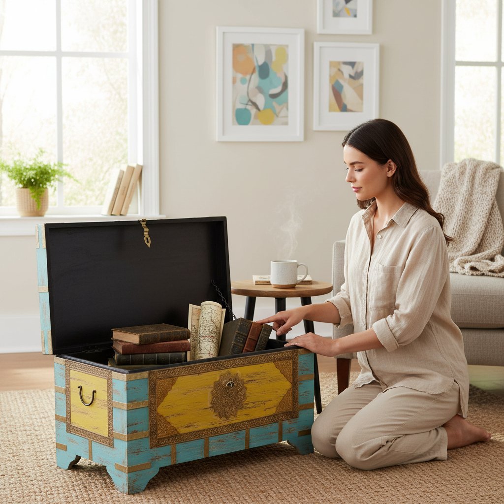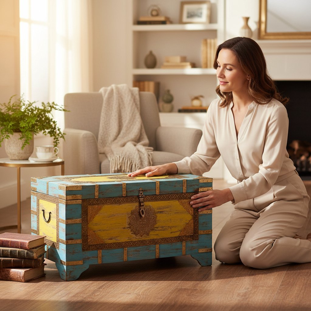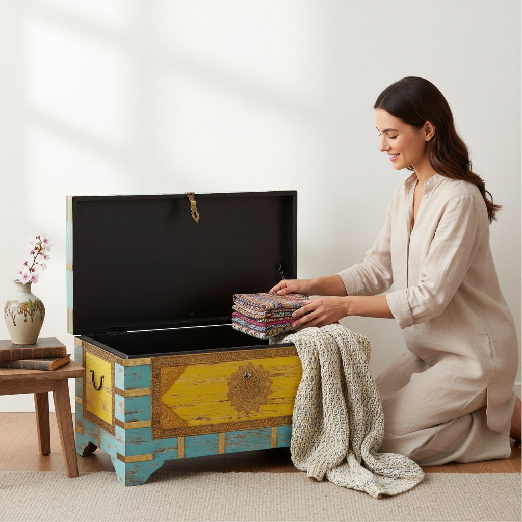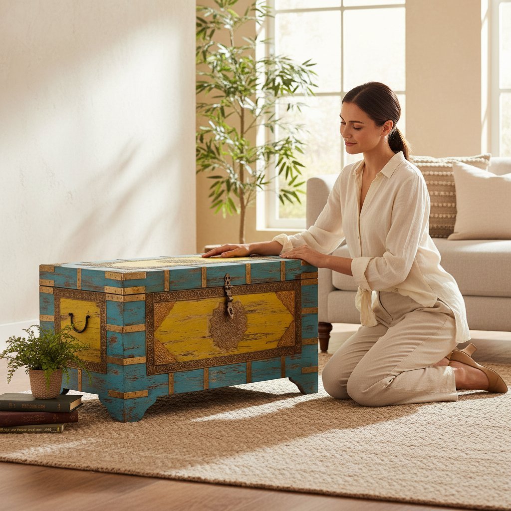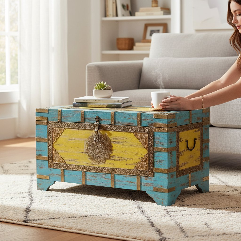 Wooden Brass Storage Trunk Box-Side Coffee Table