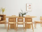 This contemporary dining set is designed to bring elegance and comfort to your home. The rectangular wooden dining table features a ribbed panel base and a smooth finish, combining durability with modern style. Accompanied by six upholstered chairs with curved backs and cushioned seats, the set provides both support and sophistication, making it perfect for everyday meals or special gatherings.