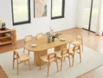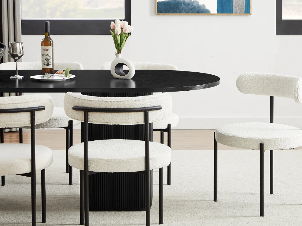 This contemporary dining set is designed to bring elegance and comfort to your home. The rectangular wooden dining table features a ribbed panel base and a smooth finish, combining durability with modern style. Accompanied by six upholstered chairs with curved backs and cushioned seats, the set provides both support and sophistication, making it perfect for everyday meals or special gatherings.