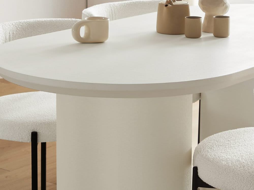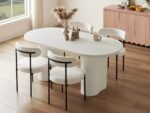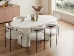 This contemporary dining set is designed to bring elegance and comfort to your home. The rectangular wooden dining table features a ribbed panel base and a smooth finish, combining durability with modern style. Accompanied by six upholstered chairs with curved backs and cushioned seats, the set provides both support and sophistication, making it perfect for everyday meals or special gatherings.