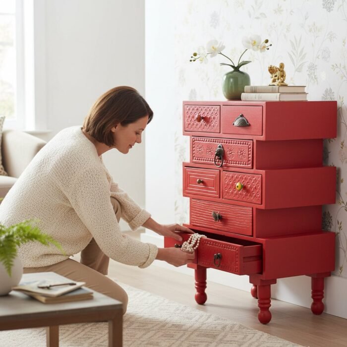 Brand : Vm Antique Decor Material : Solid Wood Dimension : L50 x W35 x H80 (cm) Finish : Handpainted Matte Colour : Bright Red Assembly : No Assembly Required Country of Origin : India Care : Clean Surfaces With a Dry Cloth.