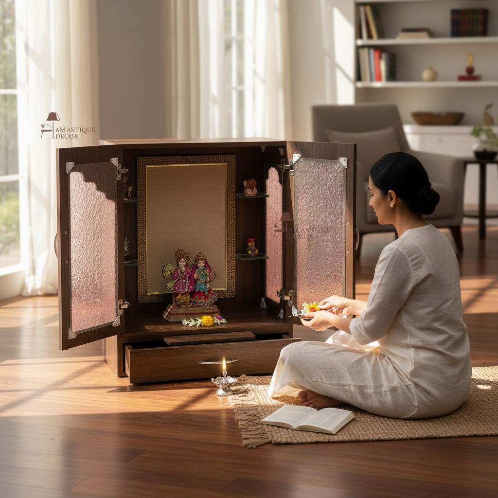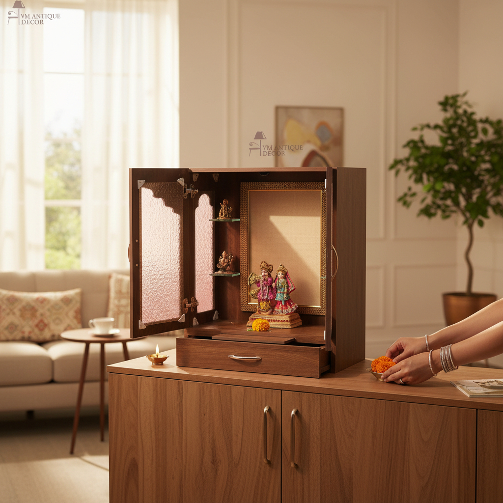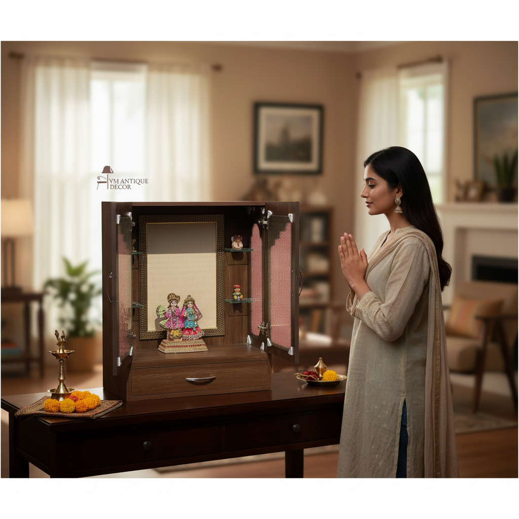 Wooden Temple Pooja Mandir Decor With Cabinet