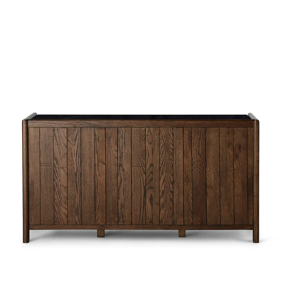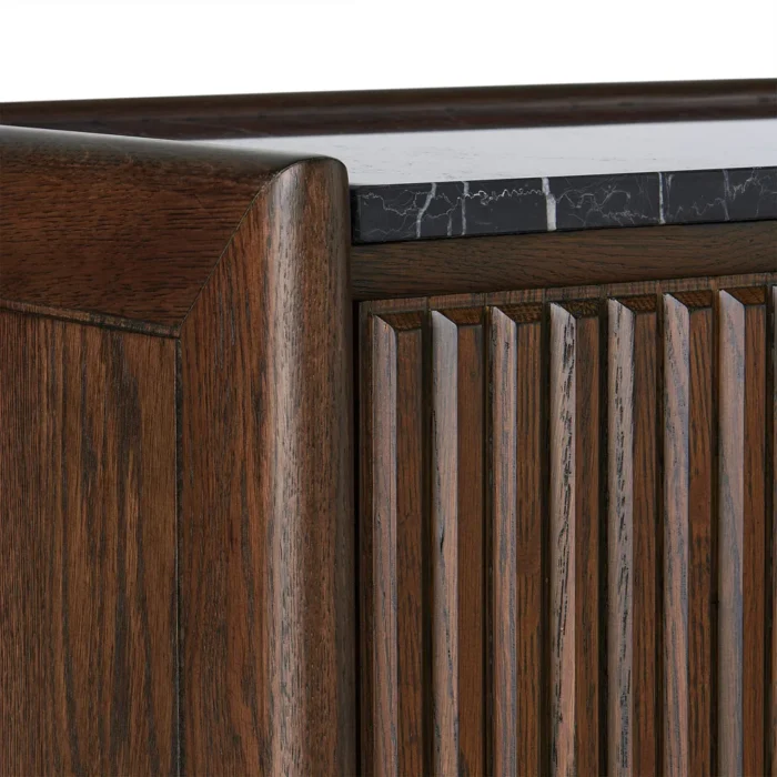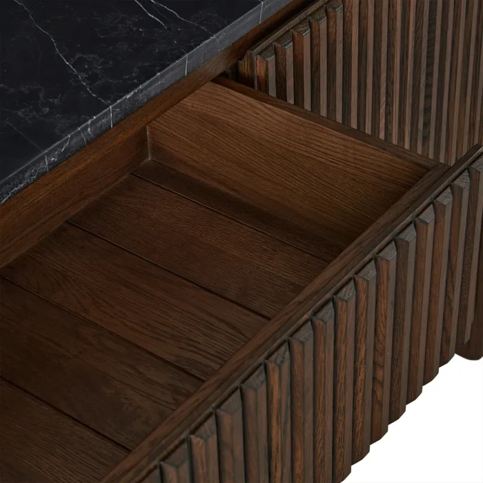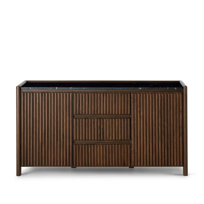 Modern Wooden Sideboard with Ribbed Doors, Drawers, and Black Marble Top