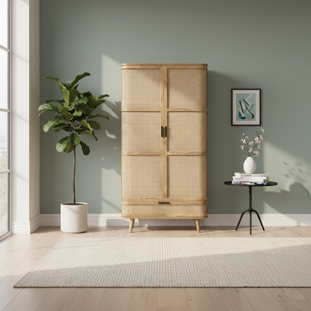 Bring warmth and elegance to your space with this Handmade Rattan Cane Wardrobe, crafted from solid mango wood and featuring a woven cane front for a timeless bohemian touch. The natural wood grain blends beautifully with airy cane detailing, making it a perfect addition to any modern, coastal, or Scandinavian-inspired home.