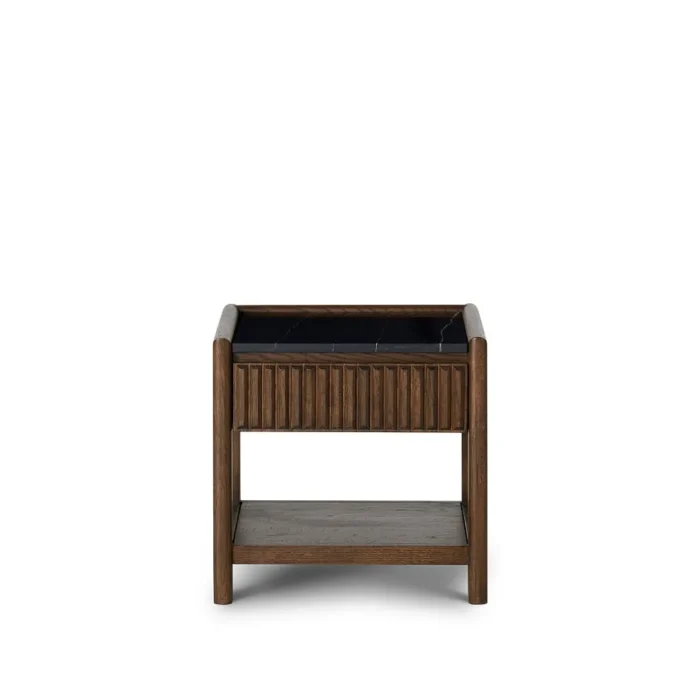 This modern wooden side table combines style and practicality, making it a perfect companion for your living room or bedroom. Designed with a sleek black marble top and ribbed detailing, it adds a touch of elegance to any space. The sturdy wooden frame includes an open lower shelf, ideal for books, décor, or everyday essentials. Compact yet functional, this table blends seamlessly into both classic and contemporary interiors.