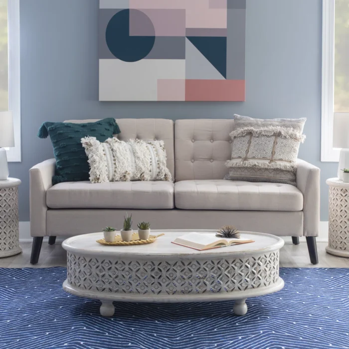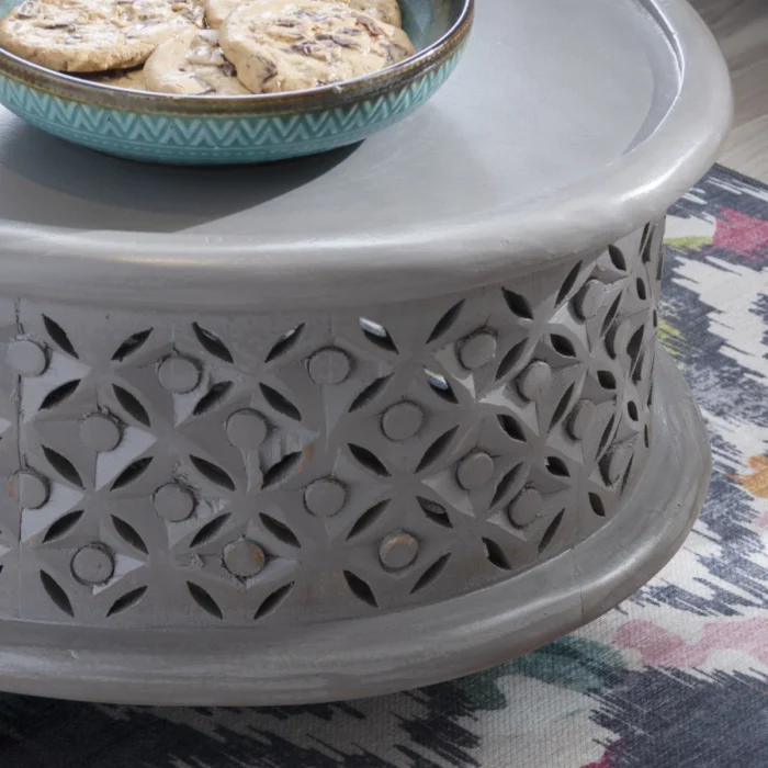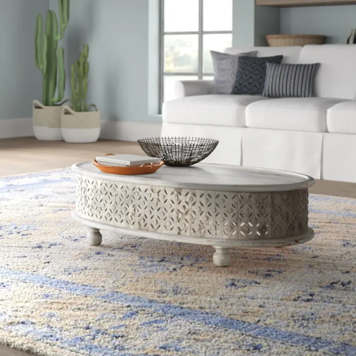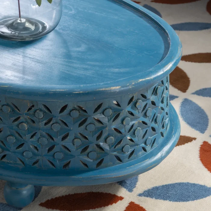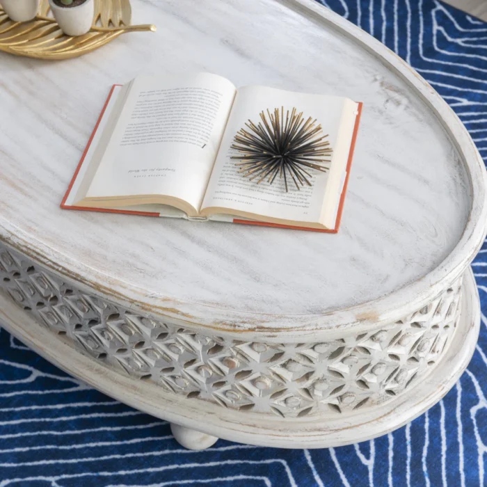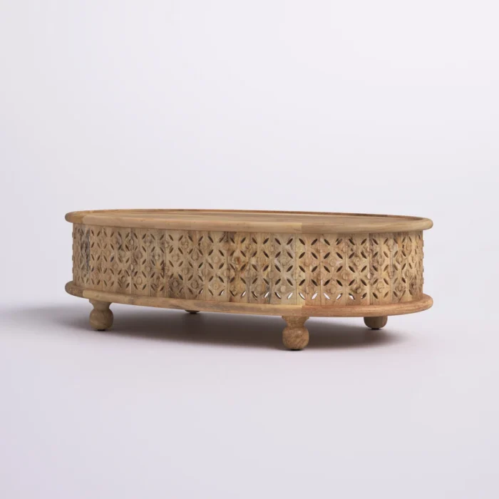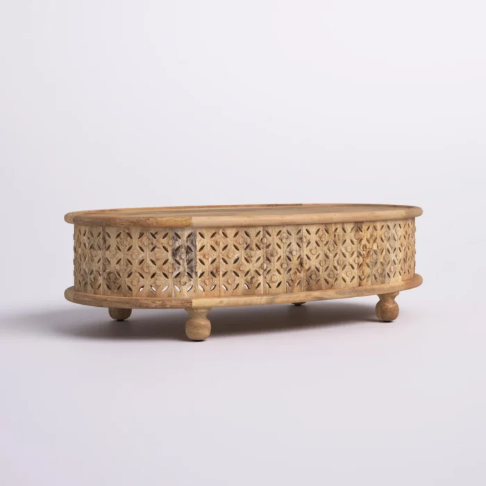 Bring elegance to your living room with this handcrafted oval coffee table, featuring intricate floral jali carving and a sturdy wooden build. Designed with a low-profile structure and round bun feet, this table perfectly complements modern, boho, and traditional interiors. Available in Natural, Black, Blue, Gray, and White finishes, it doubles as a functional centerpiece and a décor statement. Ideal for pairing with sofas, lounge chairs, or ethnic settings, this table enhances both style and usability in any home.