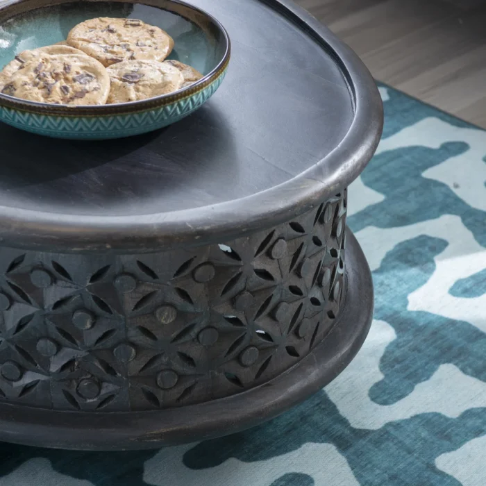 Skilled craftsmen in India employ centuries-old fire-etching techniques to create our intricate carved-wood coffee table. With a textured lattice design, circular silhouette and luxurious natural stain, it’s a magnificent way to add tone, texture and visual interest to your space. It makes an artful impact, while functioning as a useful platform in your living or family room. Colour – Brown Weight- 15 kg Size- Length- 35.5 inch x width-35.5 inch x height-12 inch Wipe clean with soft cloth. Avoid chemical cleaners This piece is intended for indoor use No assembly required Made in India