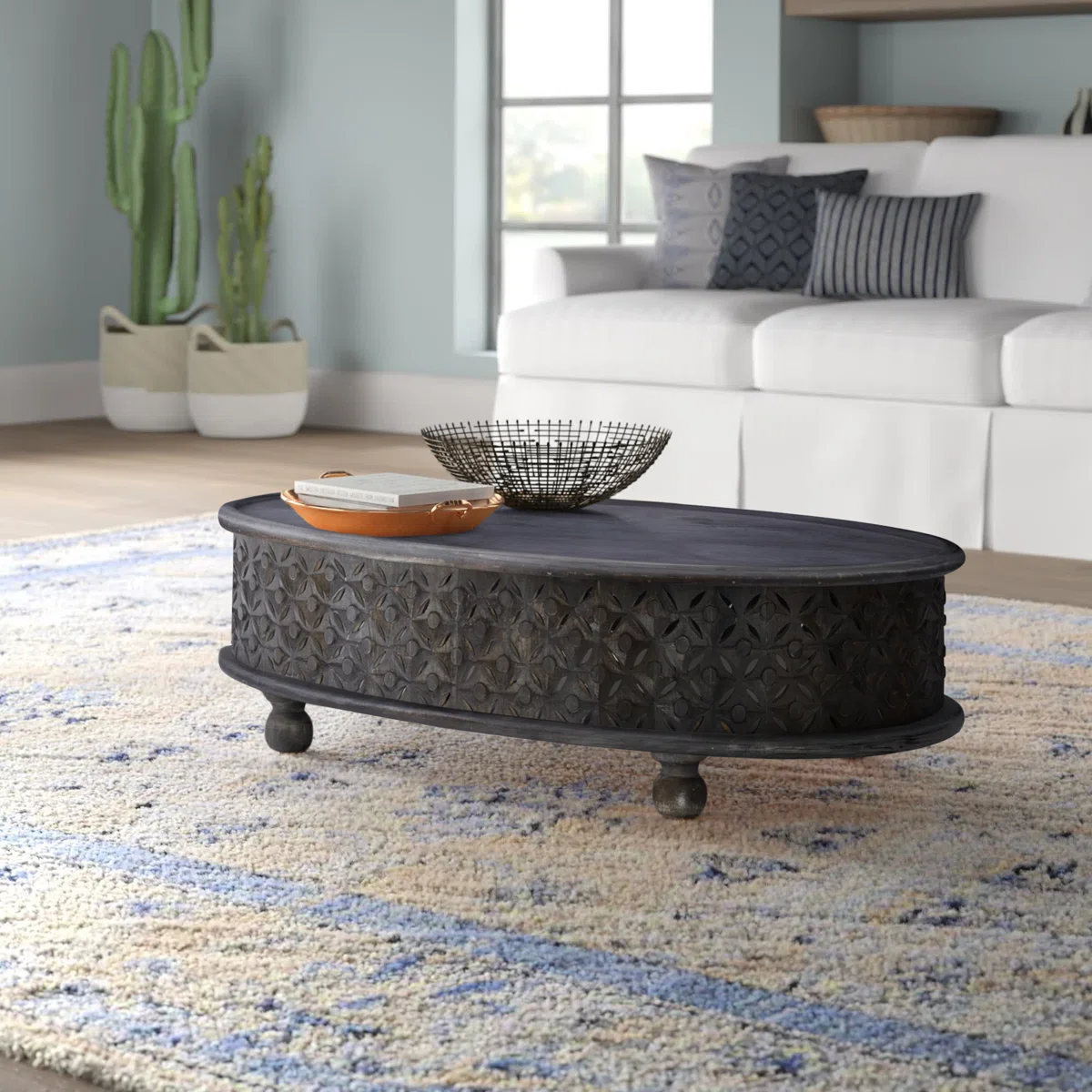 Handcrafted Wooden Carved Oval Coffee Table for Living Room – Natural, Black, Blue, Gray & White Finish
