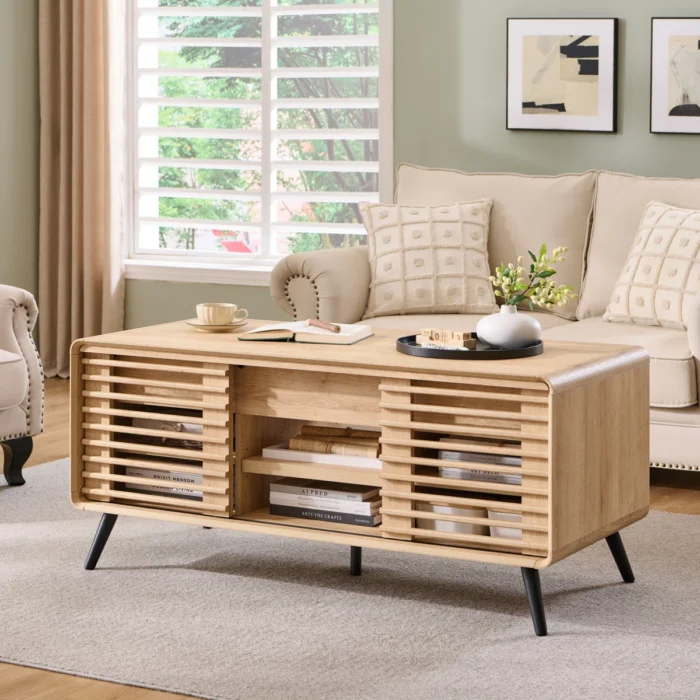 Upgrade your living room with this multi-functional wooden coffee table with lift top design, offering both style and smart storage. Featuring a hydraulic lifter mechanism, the tabletop lifts smoothly to create a convenient surface for working, dining, or studying. Beneath the lift top, there’s a large hidden storage compartment, along with open shelves and sliding slatted doors to keep books, magazines, and daily essentials organized. Crafted with a natural wood grain finish and stable tapered legs, it’s a perfect center table for modern homes in India.