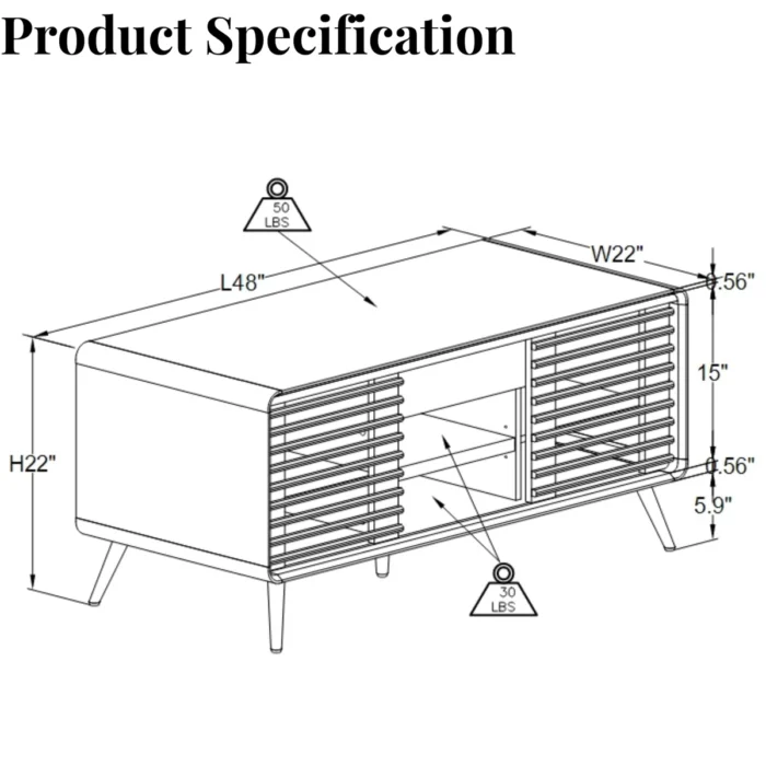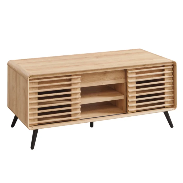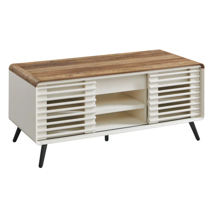 • Spacious hidden storage + open shelves + sliding slatted doors