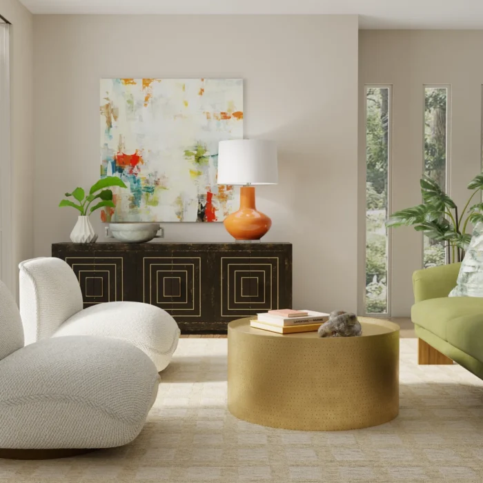 • Round drum-style coffee table with a bold modern look