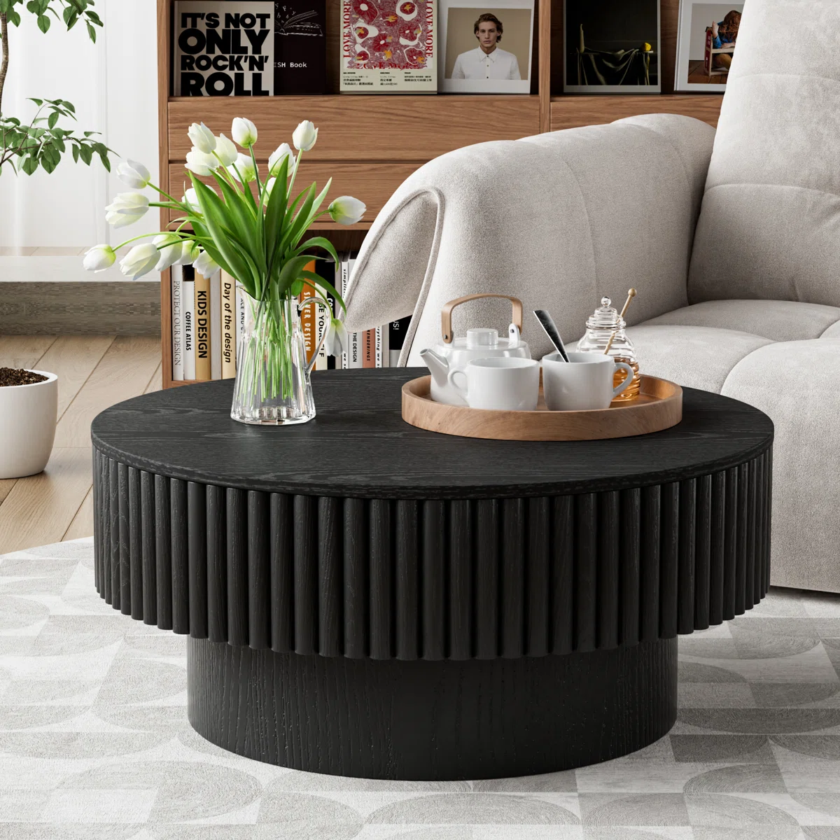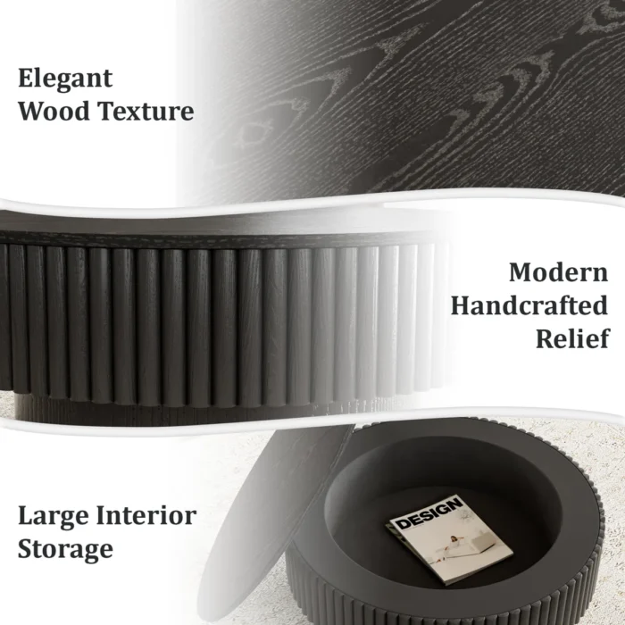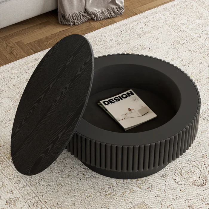 Elevate your living space with this modern round black coffee table, designed with both style and functionality in mind. Crafted with a sleek fluted base and smooth black wood finish, it adds a touch of sophistication to any room. The removable tabletop reveals a spacious hidden storage compartment, perfect for keeping magazines, remotes, or essentials neatly tucked away. Its contemporary design makes it a versatile centerpiece, seamlessly blending with modern, minimalist, or classic interiors.