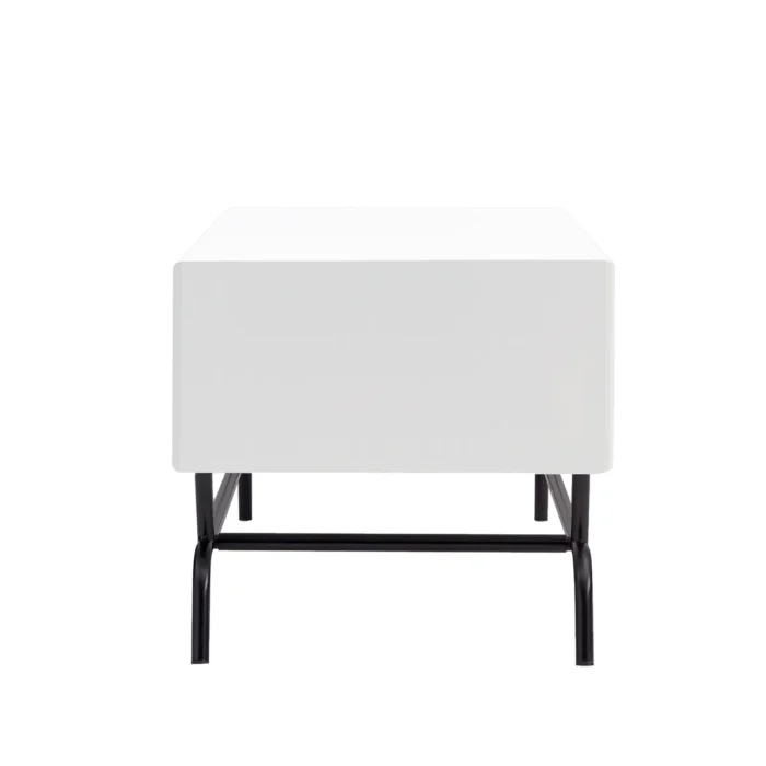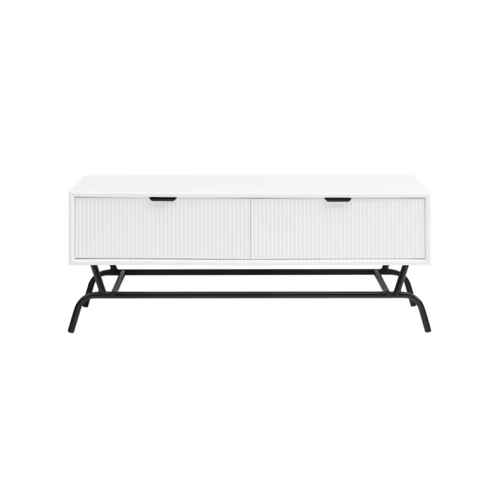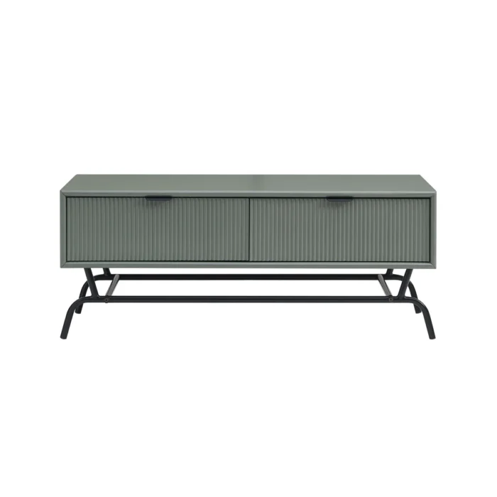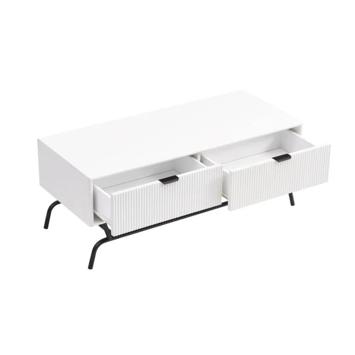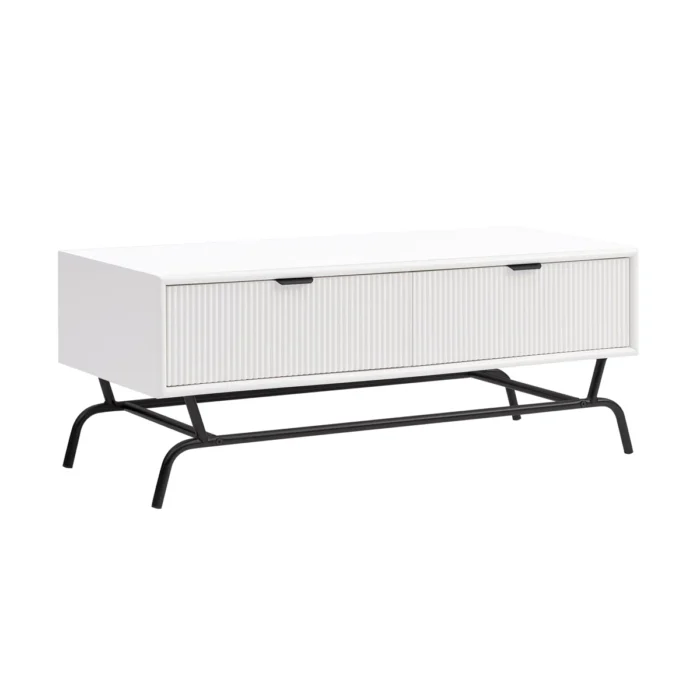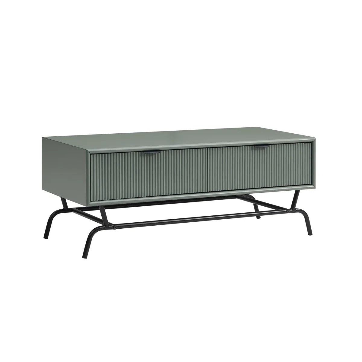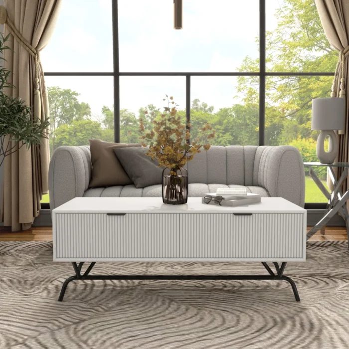 Bring style and functionality to your living room with this modern wooden coffee table featuring a sleek rectangular design and ribbed drawer fronts. Available in White and Sage Green finishes, it comes with two spacious pull-out drawers to keep your living space clutter-free. The sturdy metal base frame provides excellent support and durability, while the contemporary design makes it a perfect center table for modern homes.