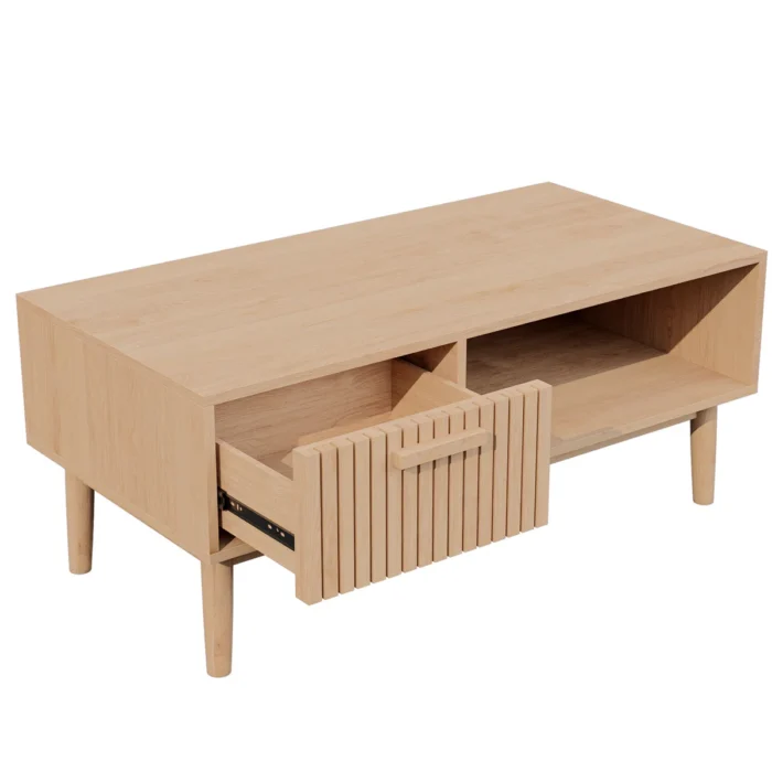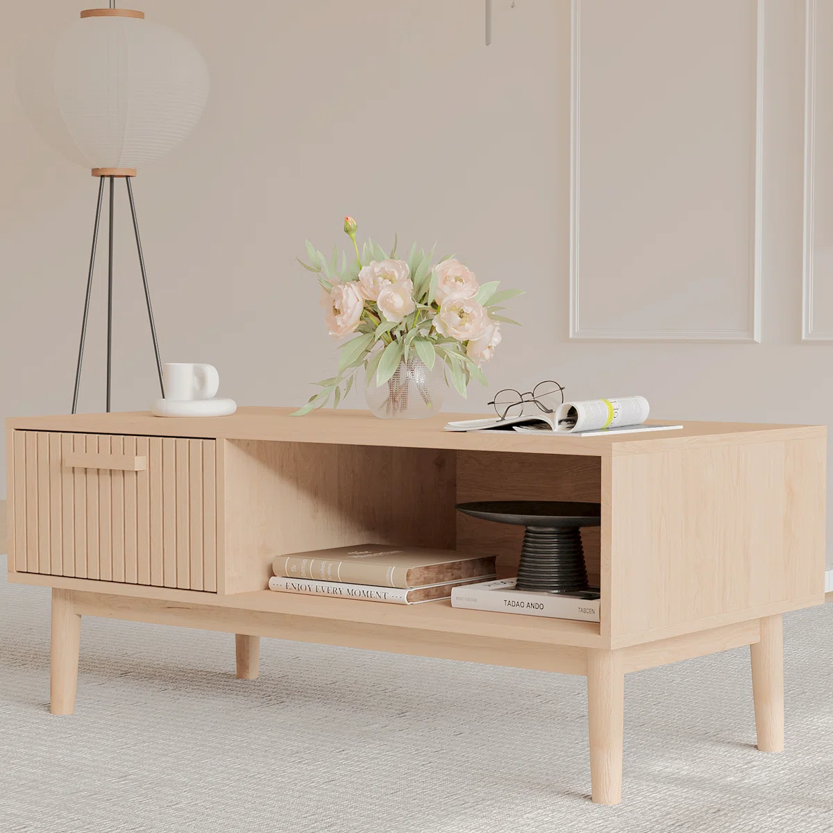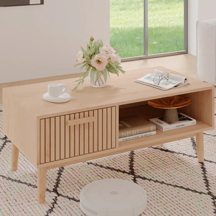 Modern Wooden Coffee Table with Storage Drawer & Open Shelf for Living Room | Solid Wood Centre Table (Natural Finish)