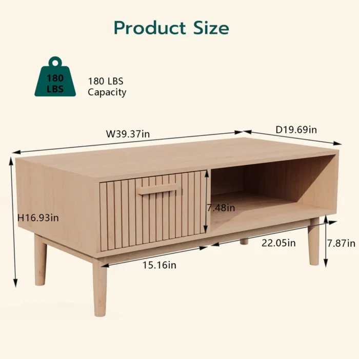 It features a spacious open shelf for books, décor items, or magazines and a sliding drawer with elegant slatted design to keep your essentials hidden and organized. The sturdy construction supports up to 180 lbs weight capacity, making it a reliable choice for daily use.