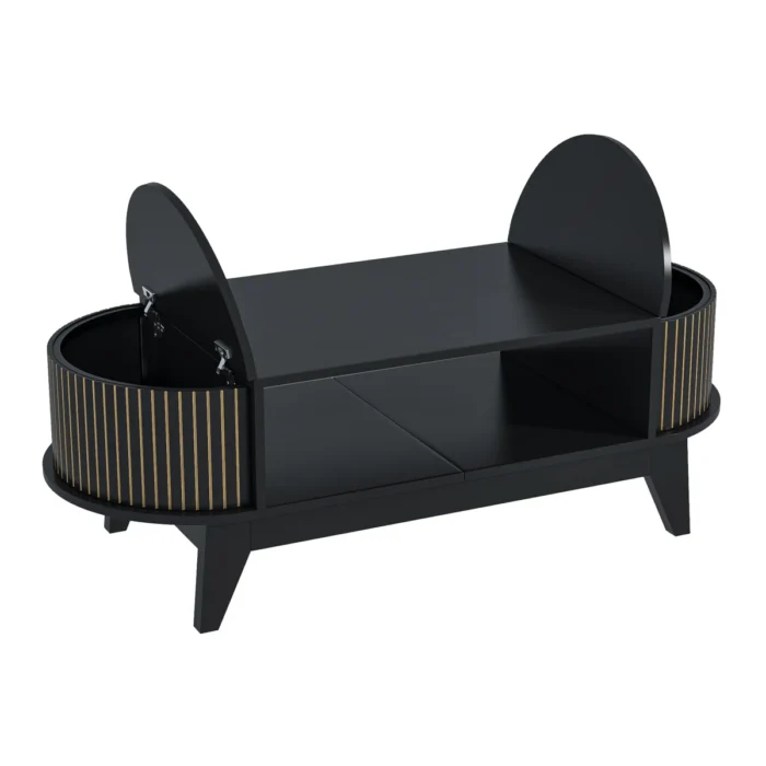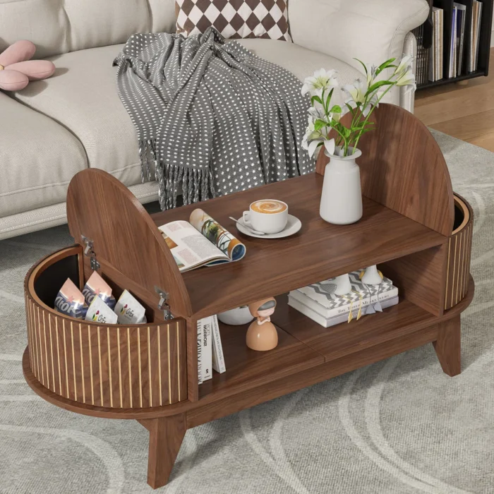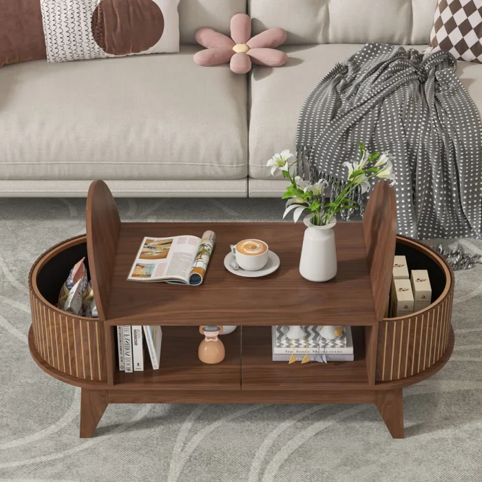 Upgrade your living room with this stylish wooden coffee table with storage in a premium walnut finish. Designed with a modern oval shape, it features hidden storage compartments on both sides and an open shelf in the center for books, magazines, and décor. The sleek golden stripe design adds a touch of elegance, while sturdy wooden legs ensure durability. Perfect for contemporary homes, this multifunctional center table combines style and utility to keep your space organized and clutter-free.