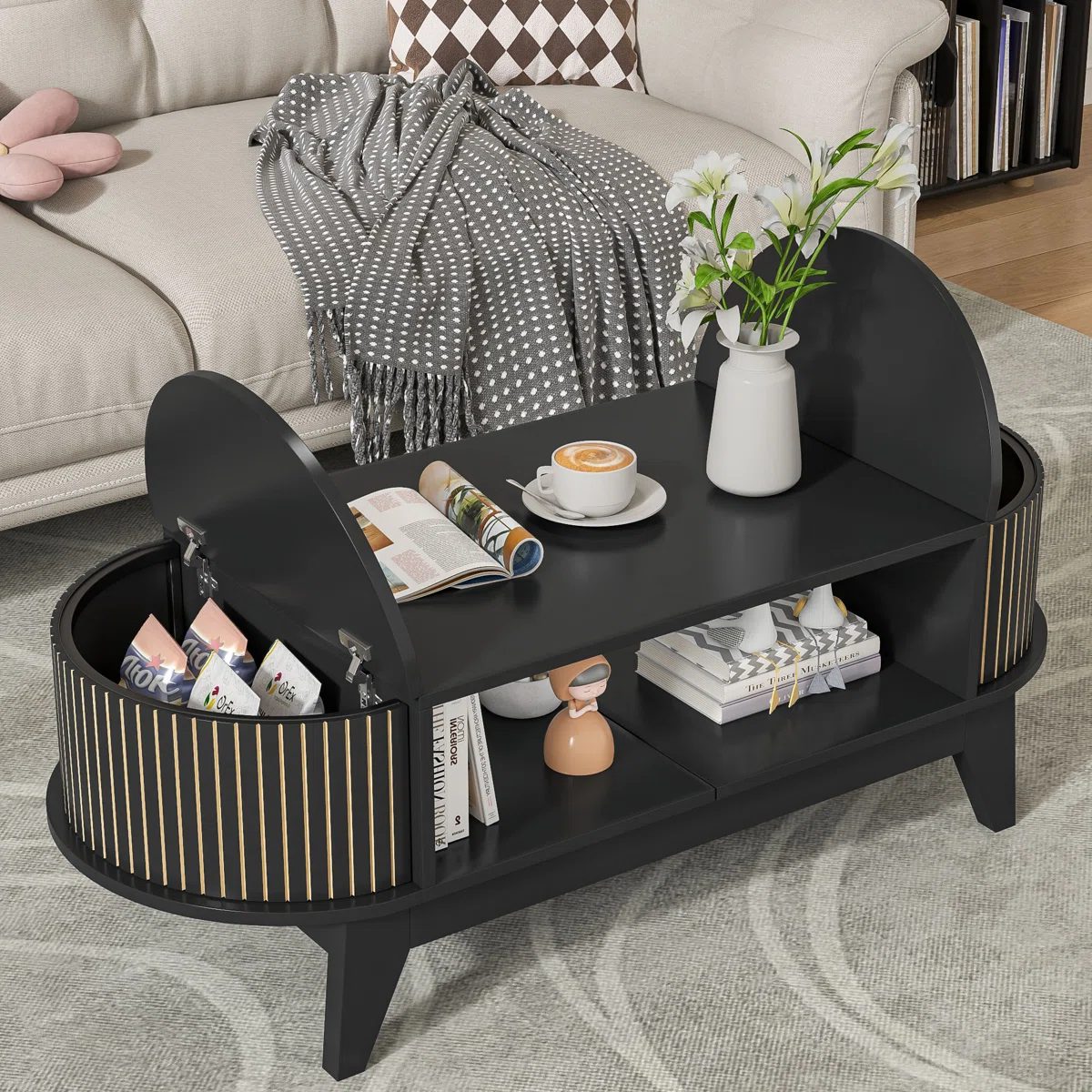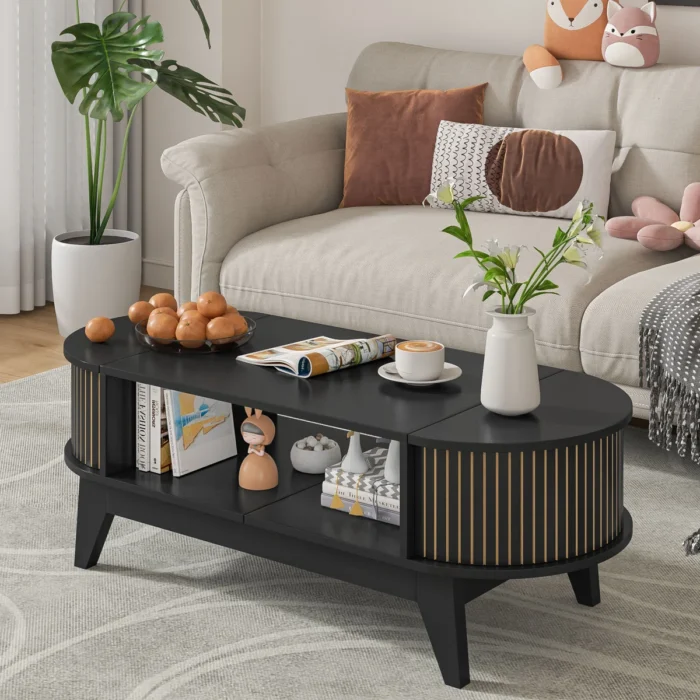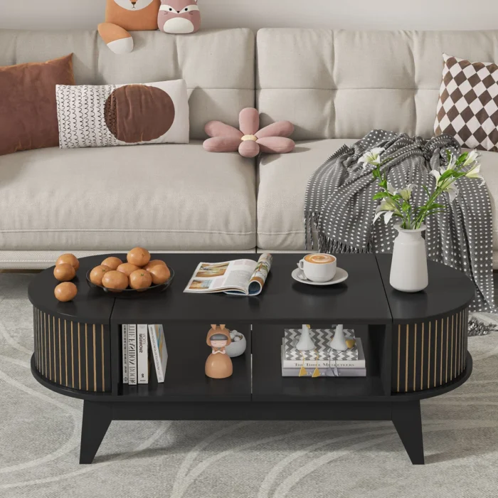 Elevate your living space with this modern round black coffee table, designed with both style and functionality in mind. Crafted with a sleek fluted base and smooth black wood finish, it adds a touch of sophistication to any room. The removable tabletop reveals a spacious hidden storage compartment, perfect for keeping magazines, remotes, or essentials neatly tucked away. Its contemporary design makes it a versatile centerpiece, seamlessly blending with modern, minimalist, or classic interiors.