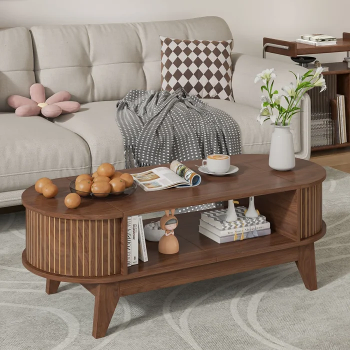 Modern Wooden Coffee Table with Storage – Walnut Finish Center Table for Living Room
